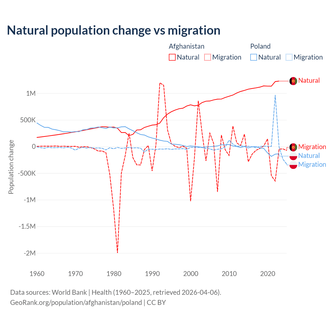 Over the last 10 years, 89% of the population change in Afghanistan is from natural causes (a gain of 11,292,049 people) and 11% is from migration (a loss of 1,396,045 people). In Poland 41.4% is from natural causes (a loss of 675,443 people) and 58.6% is from migration (a gain of 955,766 people).