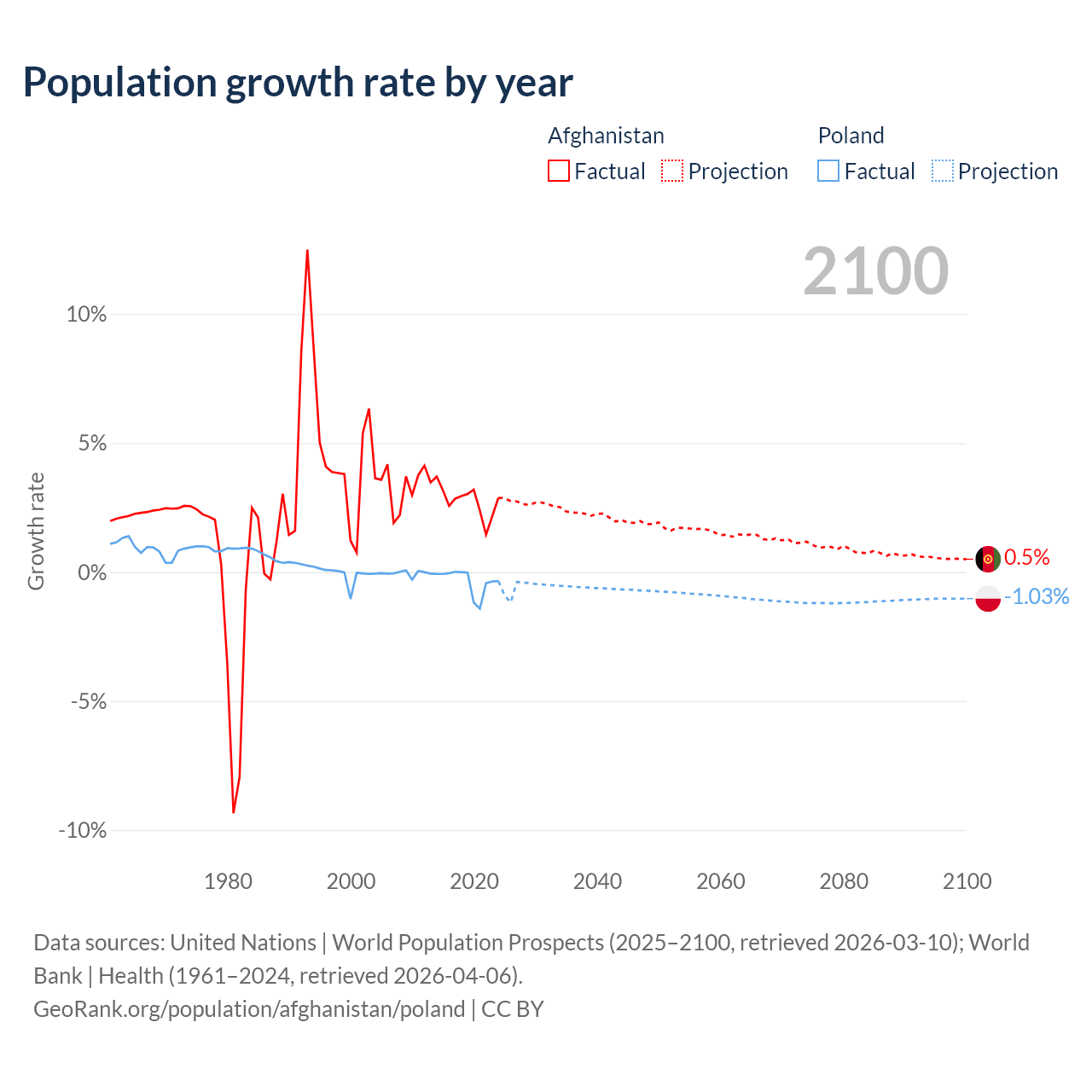- For the last 10 years, Afghanistan has had an average growth rate of +2.76% per year vs -0.36% in Poland.