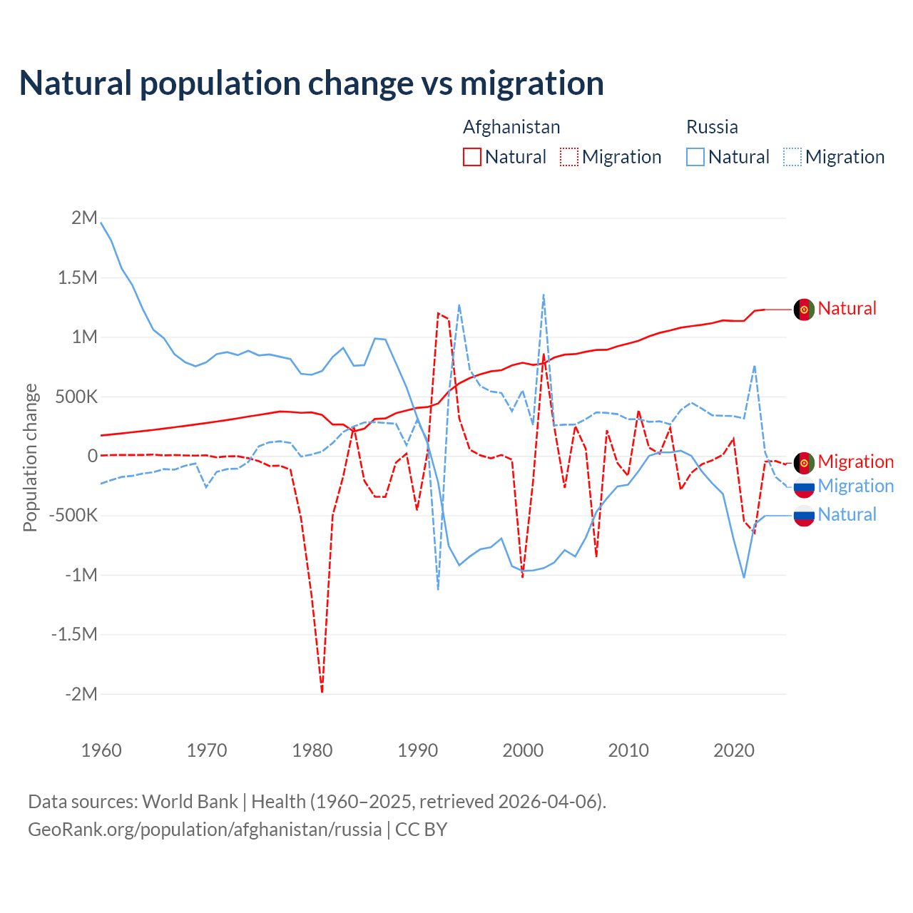 Over the last 10 years, 89% of the population change in Afghanistan is from natural causes (a gain of 11,292,049 people) and 11% is from migration (a loss of 1,396,045 people). In Russia 48.6% is from natural causes (a loss of 3,416,377 people) and 51.4% is from migration (a gain of 3,611,826 people).