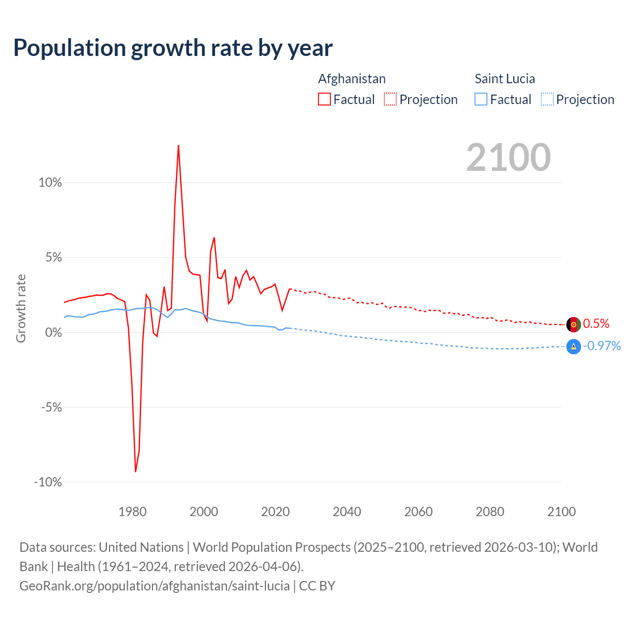 - For the last 10 years, Afghanistan has had an average growth rate of +2.76% per year vs +0.33% in Saint Lucia.