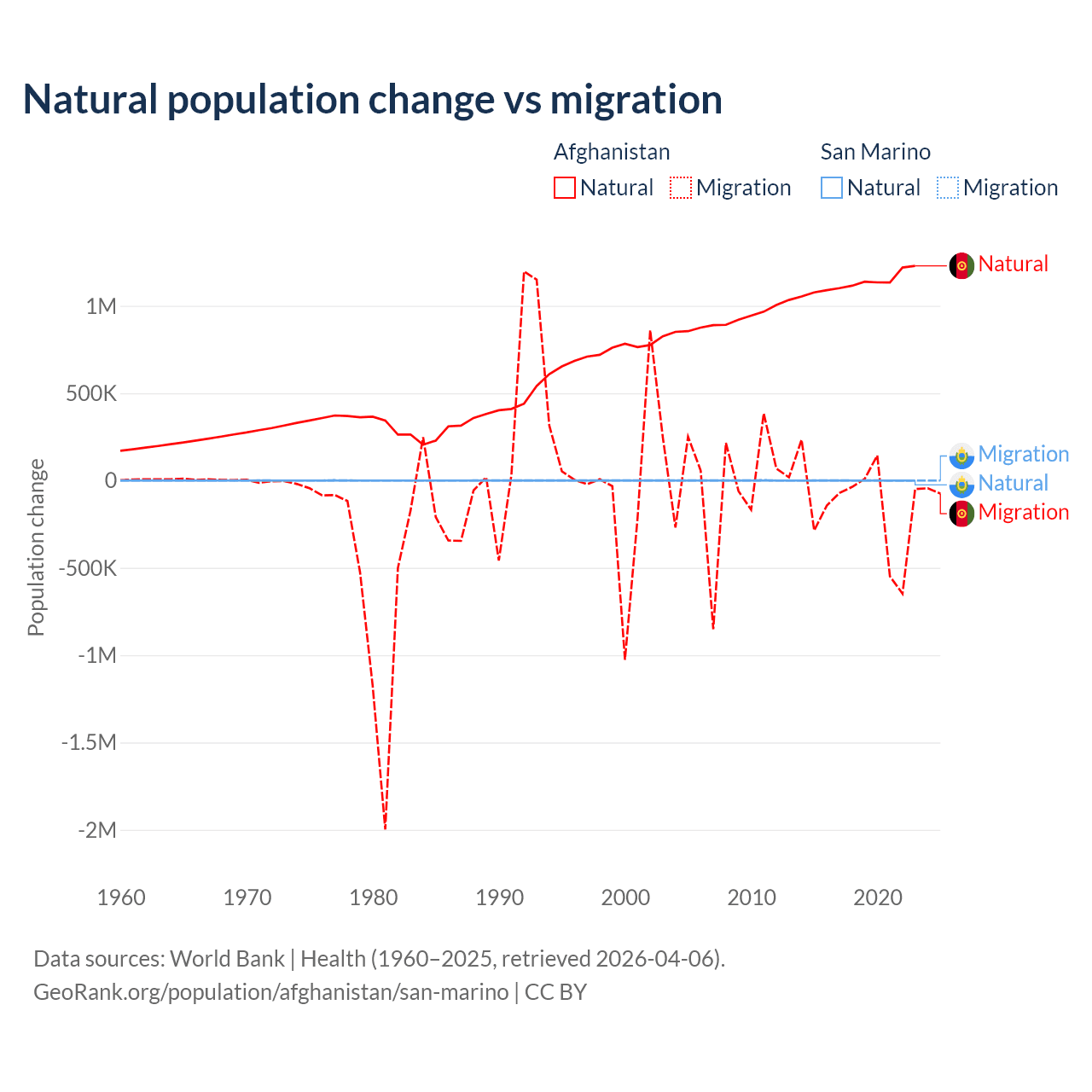 Over the last 10 years, 89% of the population change in Afghanistan is from natural causes (a gain of 11,292,049 people) and 11% is from migration (a loss of 1,396,045 people). In San Marino 40.9% is from natural causes (a loss of 358 people) and 59.1% is from migration (a gain of 517 people).