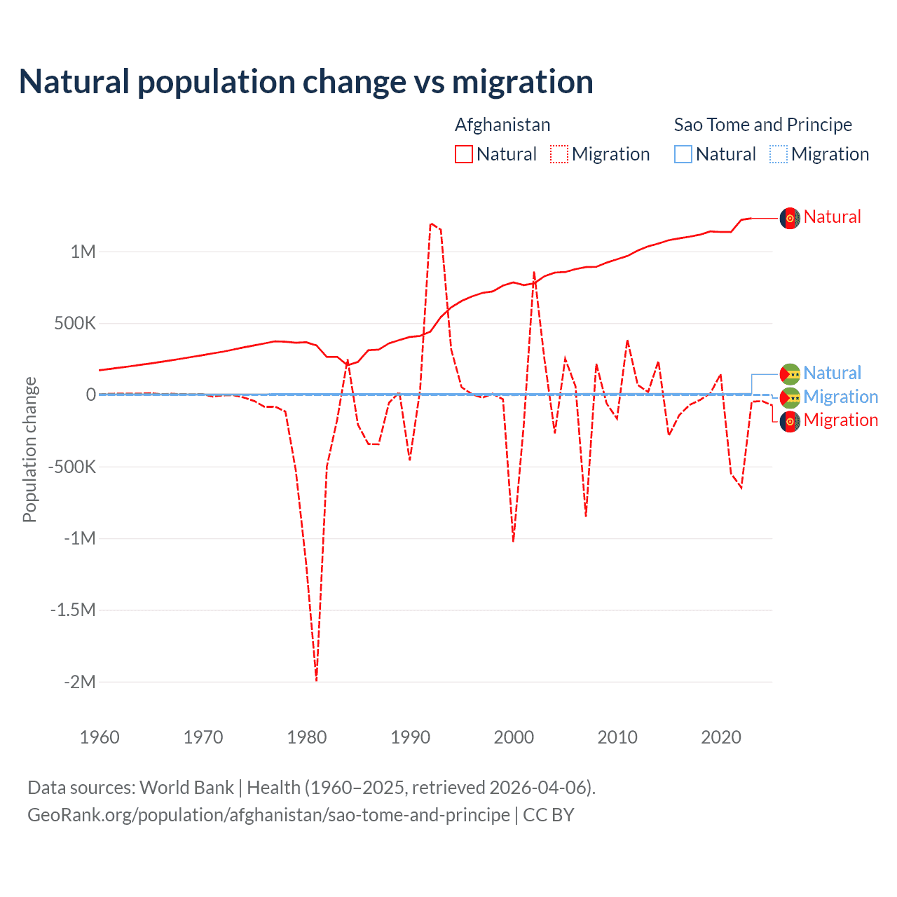 Over the last 10 years, 89% of the population change in Afghanistan is from natural causes (a gain of 11,292,049 people) and 11% is from migration (a loss of 1,396,045 people). In Sao Tome and Principe 80.1% is from natural causes (a gain of 50,822 people) and 19.9% is from migration (a loss of 12,621 people).
