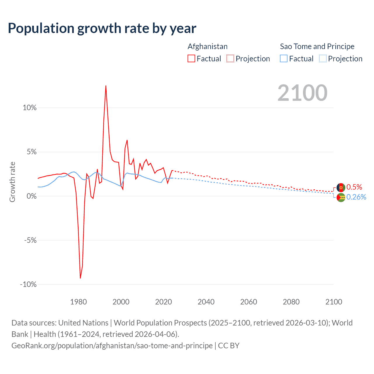 - For the last 10 years, Afghanistan has had an average growth rate of +2.76% per year vs +1.82% in Sao Tome and Principe.