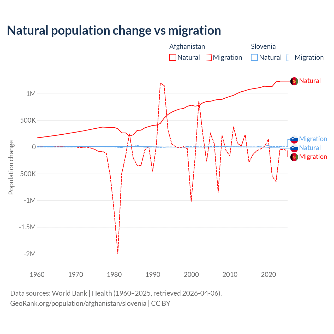 Over the last 10 years, 89% of the population change in Afghanistan is from natural causes (a gain of 11,292,049 people) and 11% is from migration (a loss of 1,396,045 people). In Slovenia 18.1% is from natural causes (a loss of 17,573 people) and 81.9% is from migration (a gain of 79,532 people).