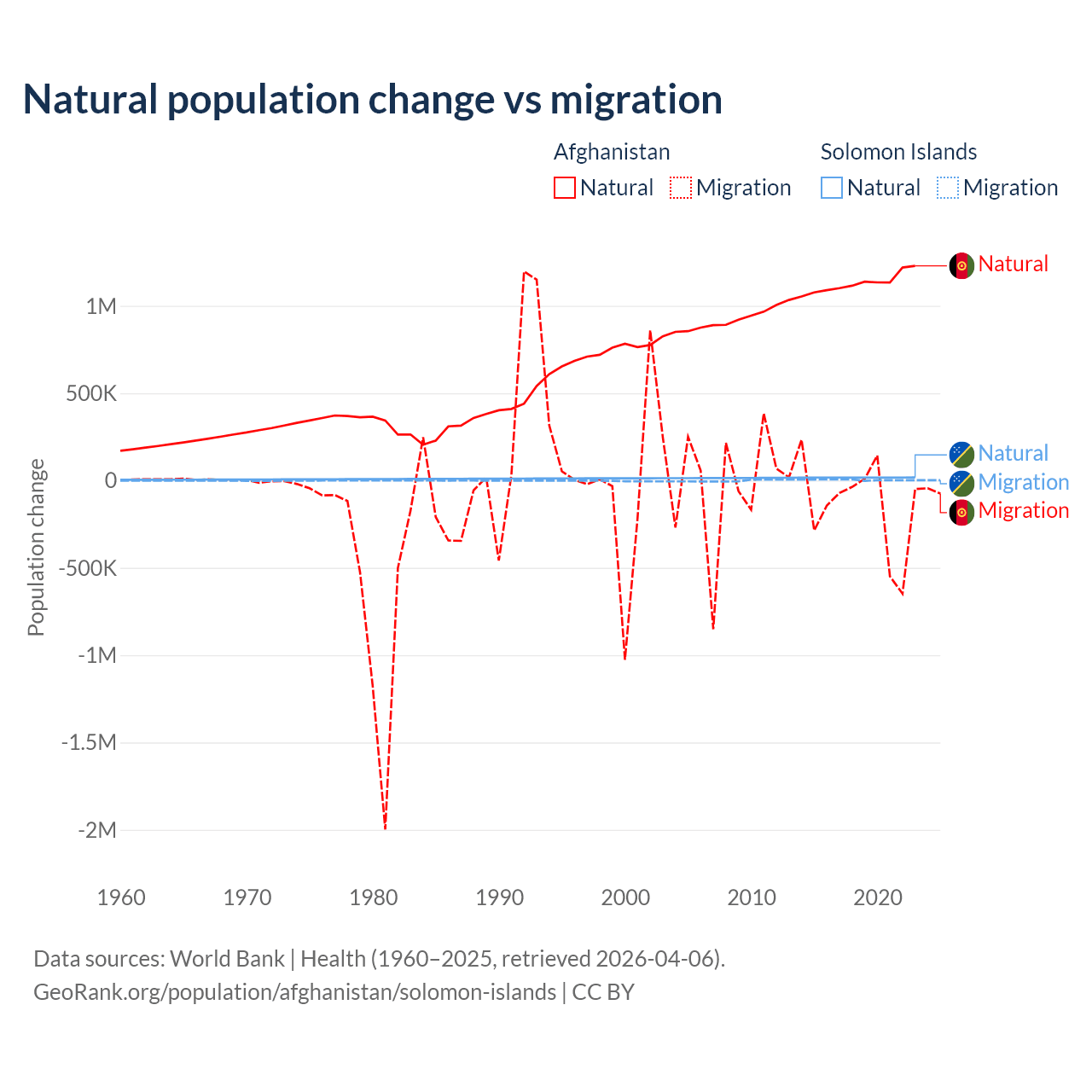 Over the last 10 years, 89% of the population change in Afghanistan is from natural causes (a gain of 11,292,049 people) and 11% is from migration (a loss of 1,396,045 people). In the Solomon Islands 82.8% is from natural causes (a gain of 168,727 people) and 17.2% is from migration (a gain of 35,031 people).