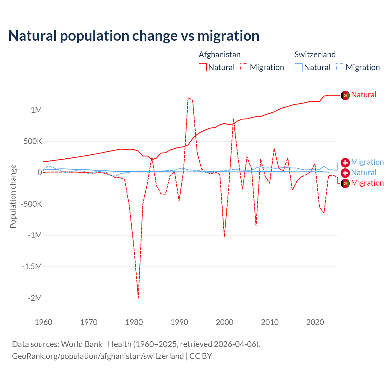 Over the last 10 years, 89% of the population change in Afghanistan is from natural causes (a gain of 11,292,049 people) and 11% is from migration (a loss of 1,396,045 people). In Switzerland 21.6% is from natural causes (a gain of 165,354 people) and 78.4% is from migration (a gain of 600,145 people).