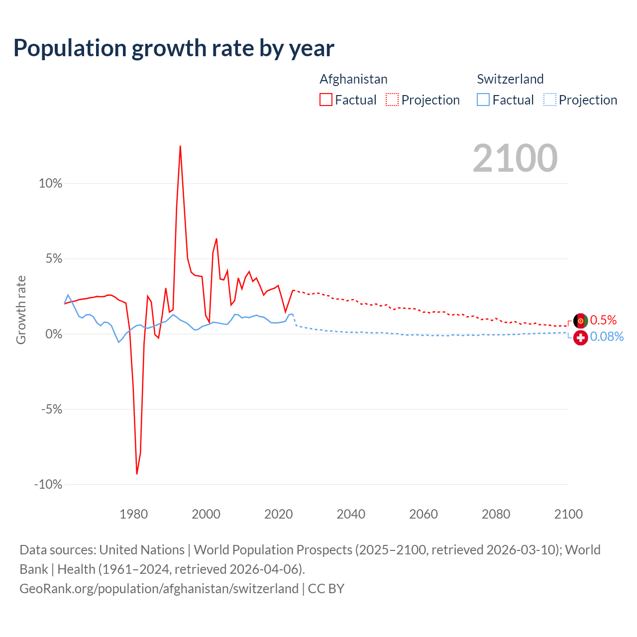 - For the last 10 years, Afghanistan has had an average growth rate of +2.76% per year vs +0.98% in Switzerland.