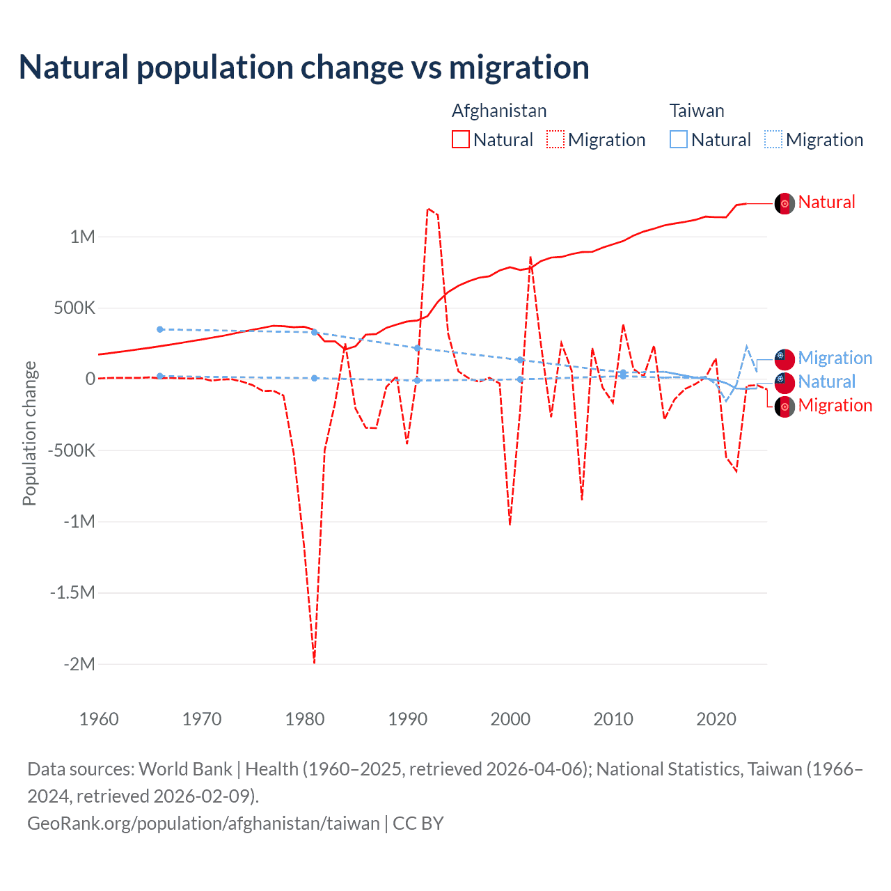 Over the last 10 years, 89% of the population change in Afghanistan is from natural causes (a gain of 11,292,049 people) and 11% is from migration (a loss of 1,396,045 people). In Taiwan 56.7% is from natural causes (a loss of 57,467 people) and 43.3% is from migration (a gain of 43,884 people).