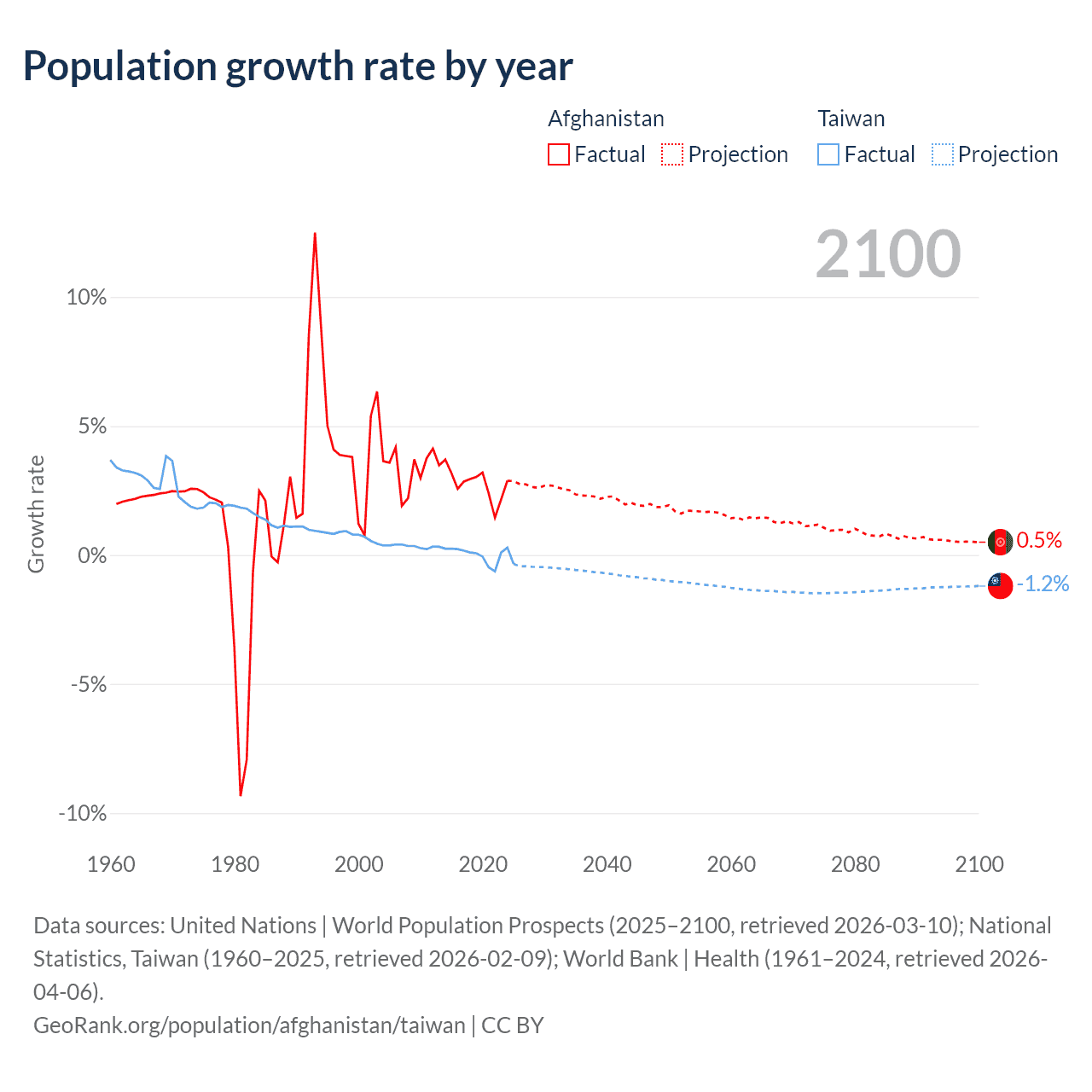 - For the last 10 years, Afghanistan has had an average growth rate of +2.76% per year vs -0.03% in Taiwan.