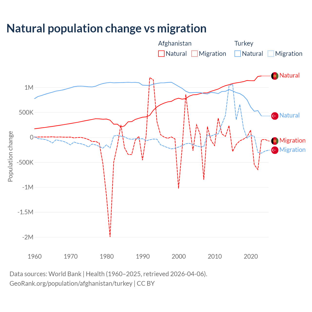 Over the last 10 years, 89% of the population change in Afghanistan is from natural causes (a gain of 11,292,049 people) and 11% is from migration (a loss of 1,396,045 people). In Turkey 73% is from natural causes (a gain of 7,333,352 people) and 27% is from migration (a gain of 2,718,916 people).