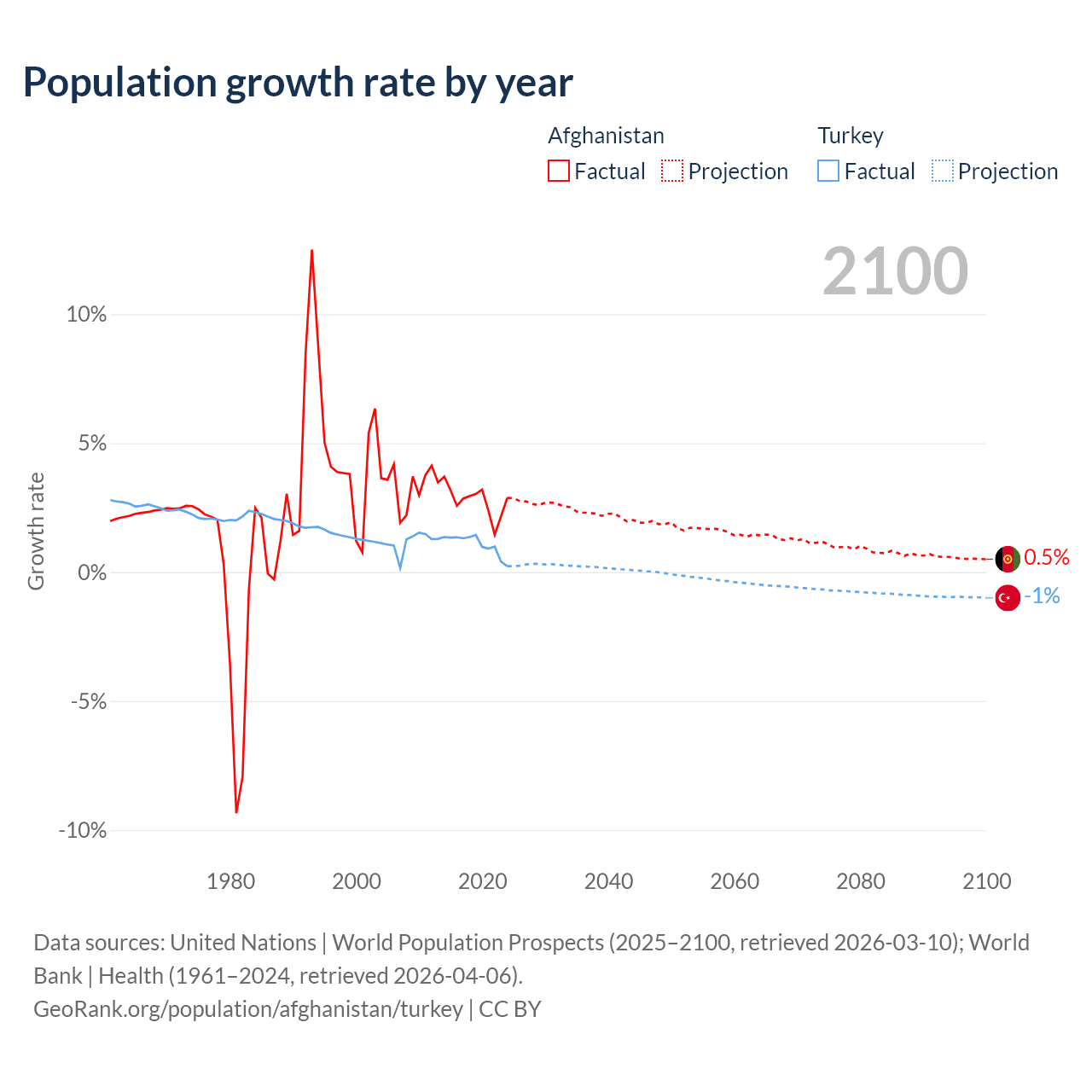 - For the last 10 years, Afghanistan has had an average growth rate of +2.76% per year vs +1.06% in Turkey.