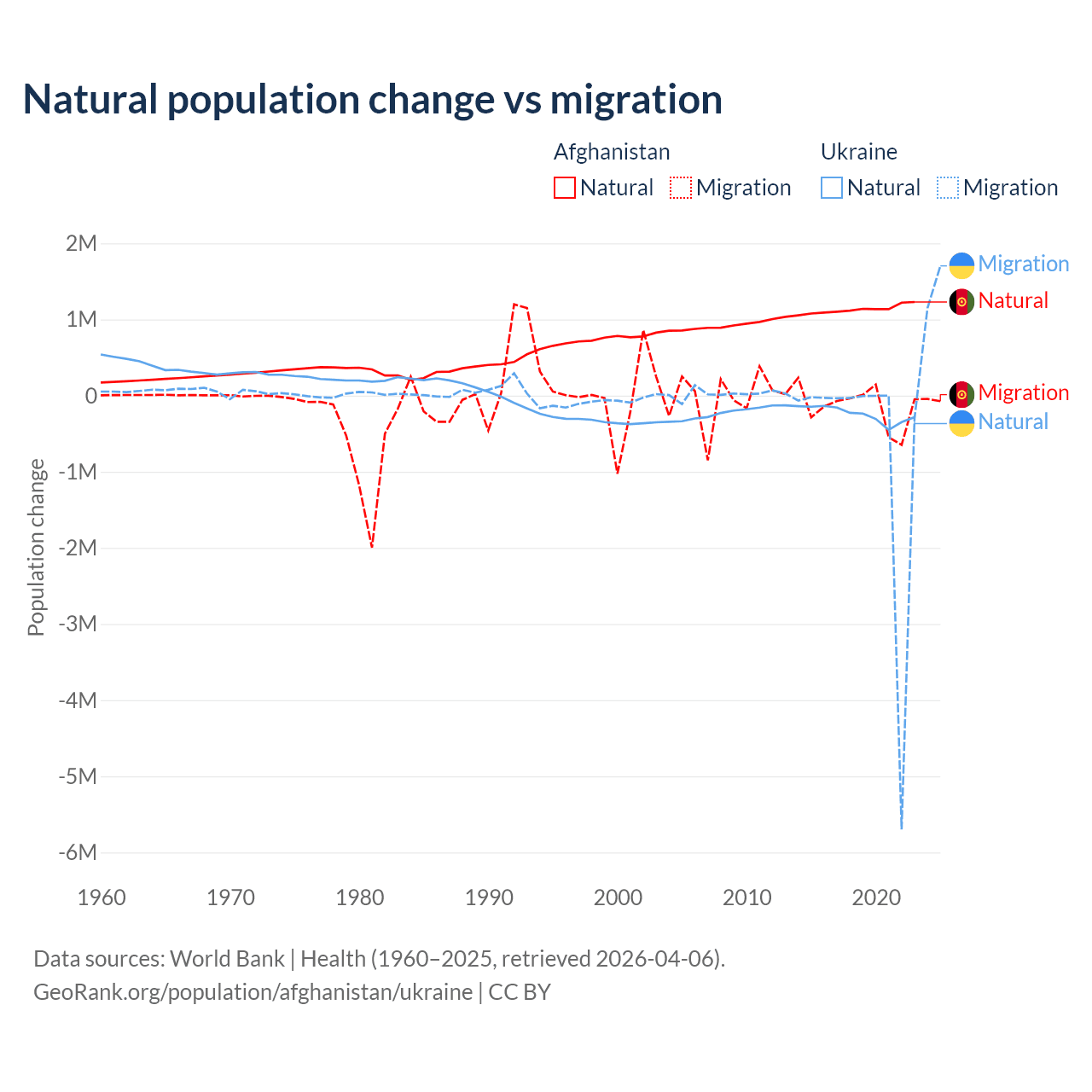 Over the last 10 years, 89% of the population change in Afghanistan is from natural causes (a gain of 11,292,049 people) and 11% is from migration (a loss of 1,396,045 people). In Ukraine 28.2% is from natural causes (a loss of 2,435,153 people) and 71.8% is from migration (a loss of 6,198,995 people).