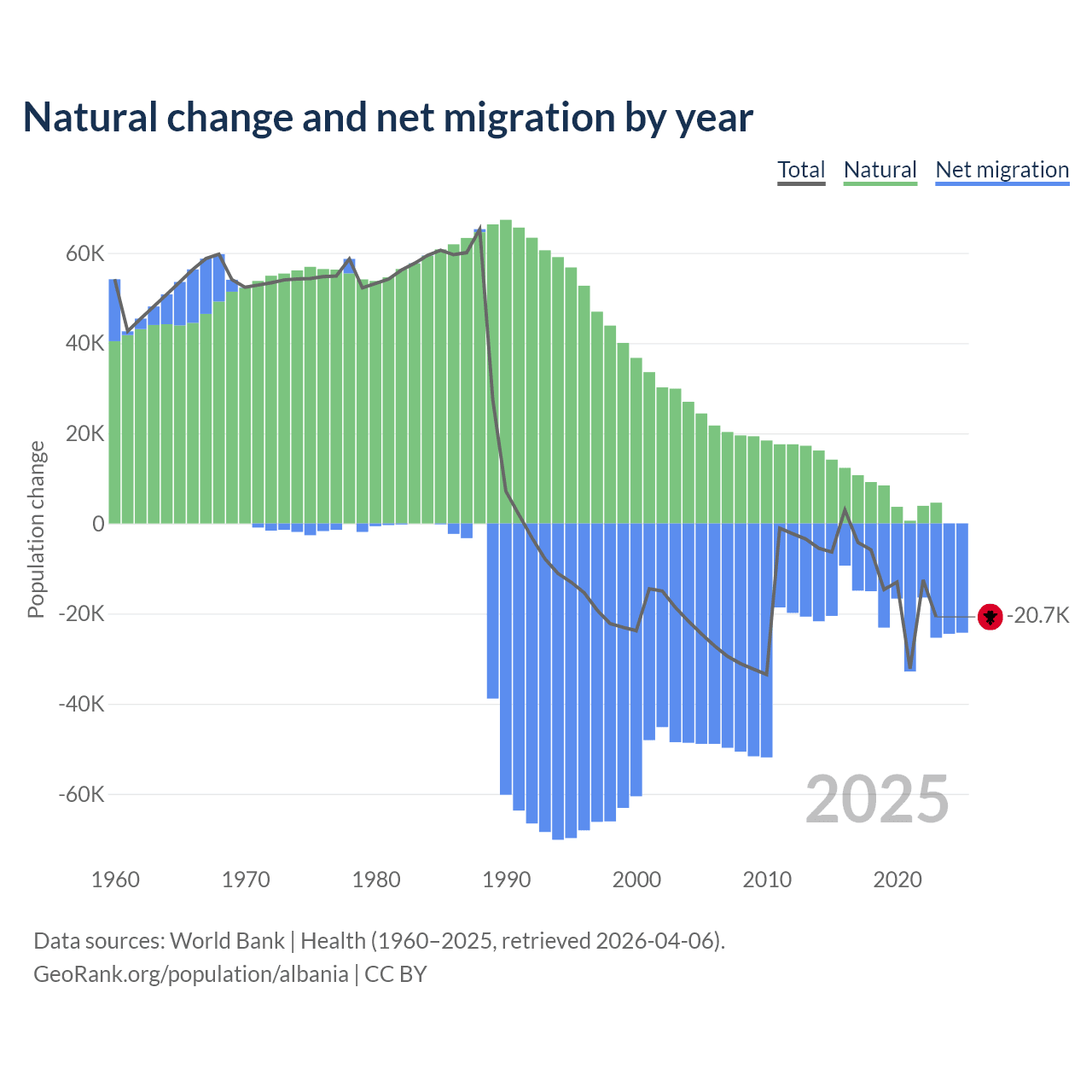Over the last 10 years, 30% of the population change in Albania is from natural causes (a gain of 83,840 people) and 70% is from migration (a loss of 195,891 people).