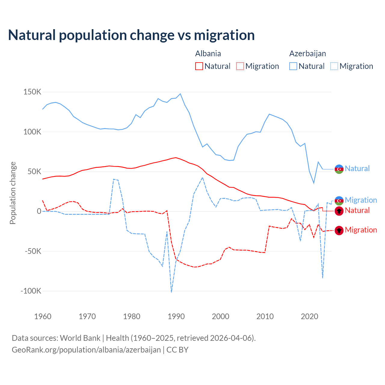 Over the last 10 years, 30% of the population change in Albania is from natural causes (a gain of 83,840 people) and 70% is from migration (a loss of 195,891 people). In Azerbaijan 87.2% is from natural causes (a gain of 782,840 people) and 12.8% is from migration (a loss of 114,572 people).