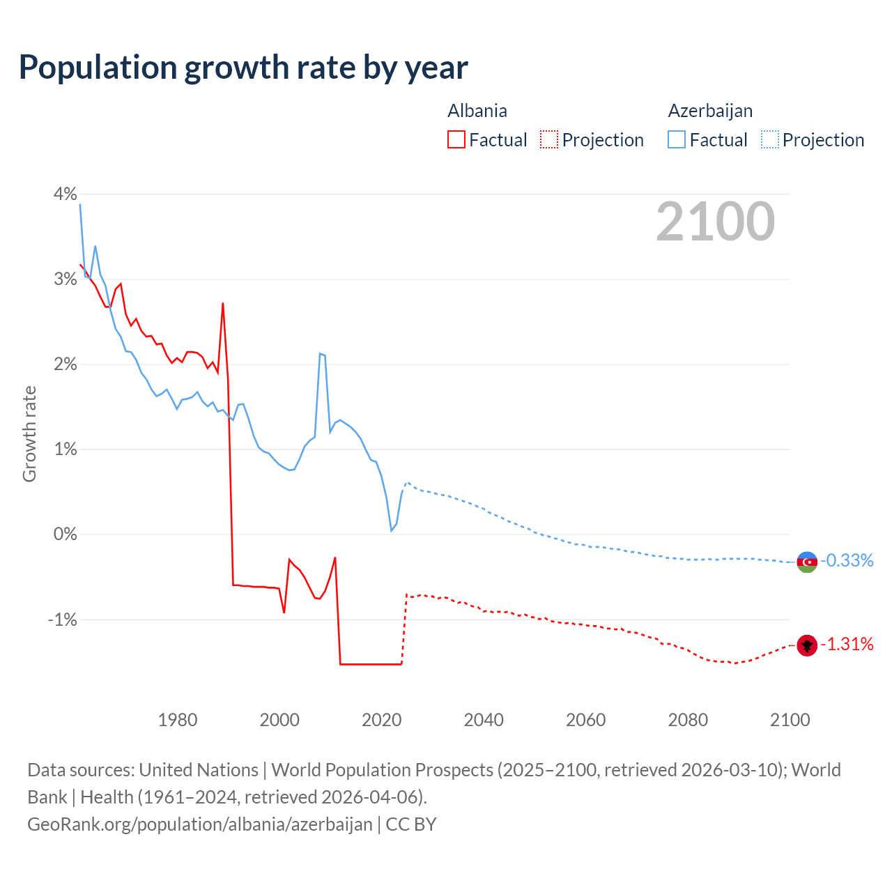 - For the last 10 years, Albania has had an average growth rate of -1.53% per year vs +0.73% in Azerbaijan.