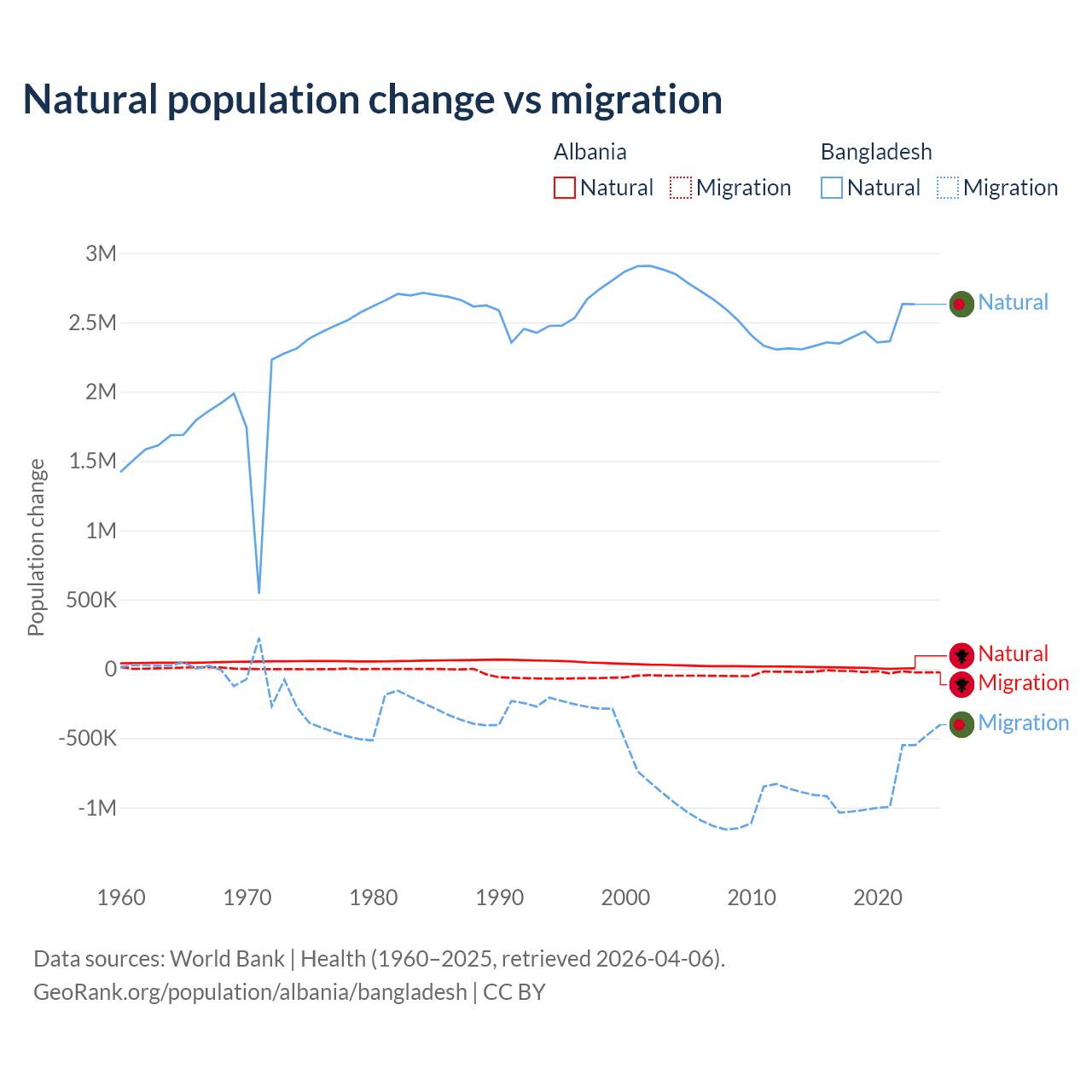Over the last 10 years, 30% of the population change in Albania is from natural causes (a gain of 83,840 people) and 70% is from migration (a loss of 195,891 people). In Bangladesh 73.1% is from natural causes (a gain of 24,148,039 people) and 26.9% is from migration (a loss of 8,897,408 people).