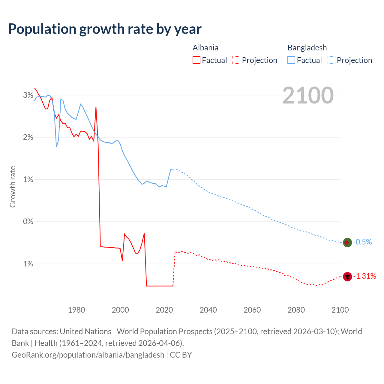 - For the last 10 years, Albania has had an average growth rate of -1.53% per year vs +0.94% in Bangladesh.