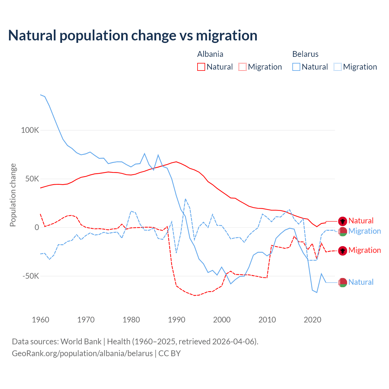 Over the last 10 years, 30% of the population change in Albania is from natural causes (a gain of 83,840 people) and 70% is from migration (a loss of 195,891 people). In Belarus 84.2% is from natural causes (a loss of 318,682 people) and 15.8% is from migration (a loss of 59,605 people).
