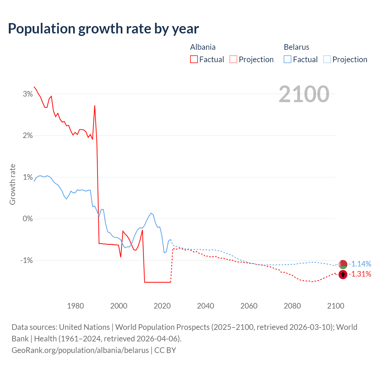 - For the last 10 years, Albania has had an average growth rate of -1.53% per year vs -0.3% in Belarus.