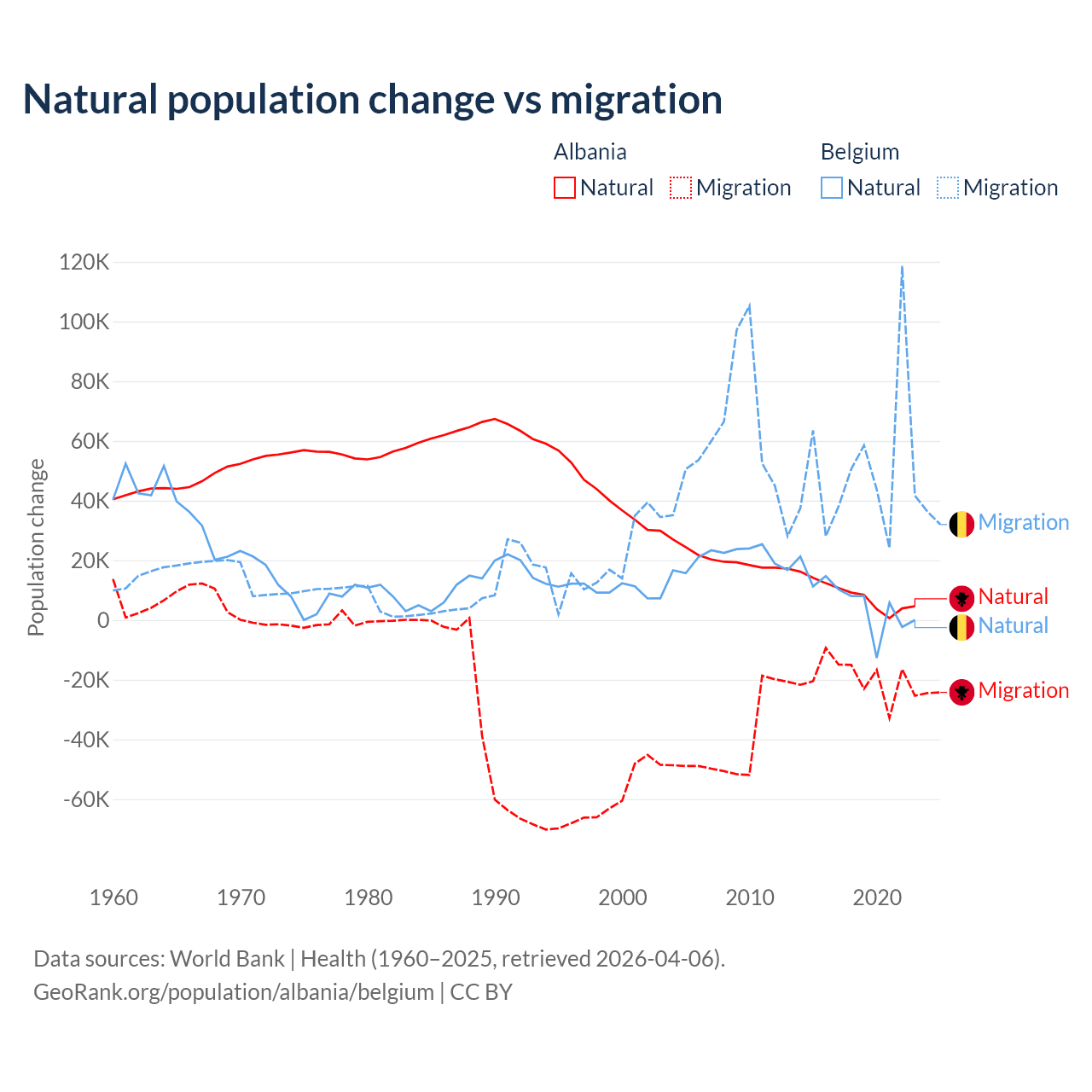 Over the last 10 years, 30% of the population change in Albania is from natural causes (a gain of 83,840 people) and 70% is from migration (a loss of 195,891 people). In Belgium 11.3% is from natural causes (a gain of 64,346 people) and 88.7% is from migration (a gain of 504,240 people).