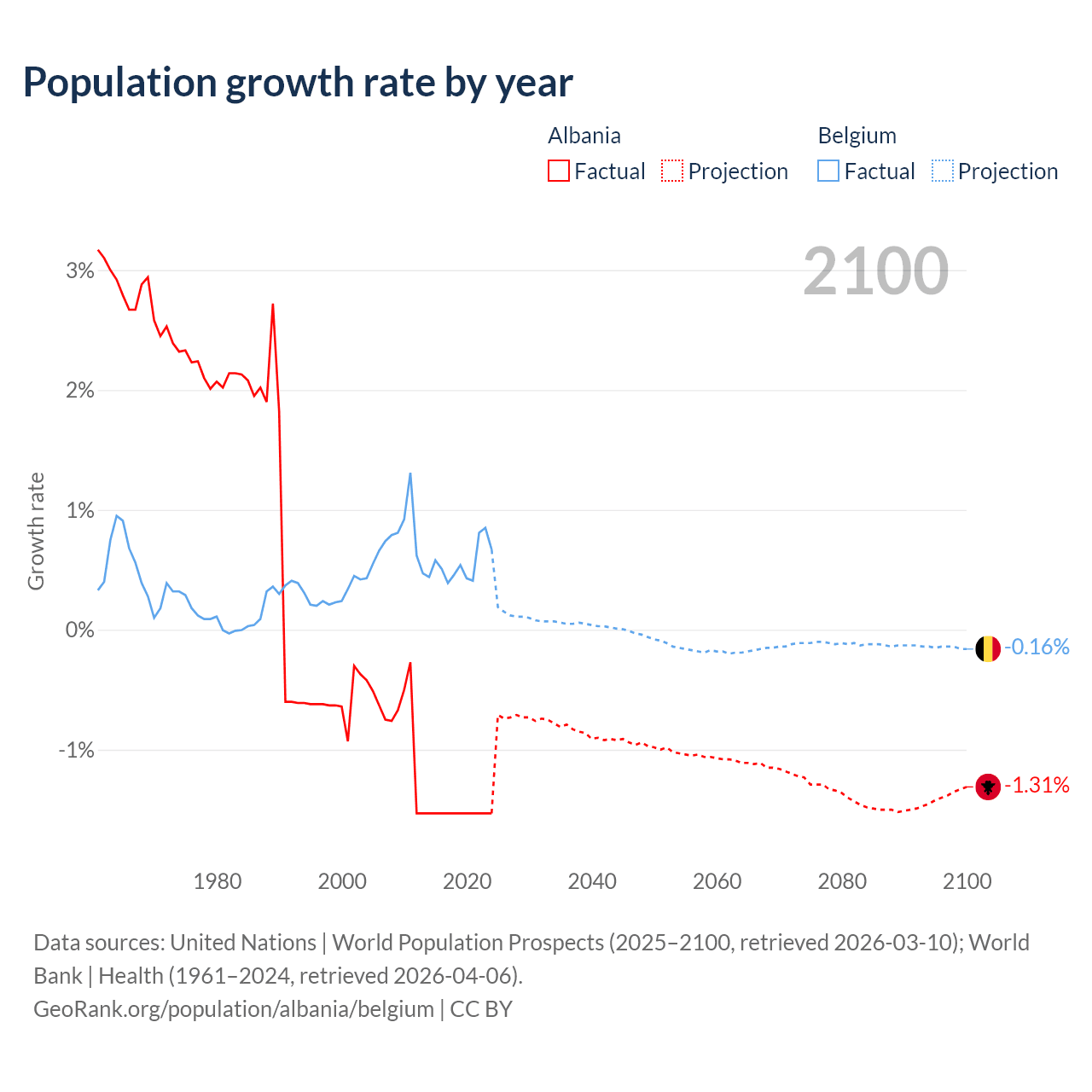 - For the last 10 years, Albania has had an average growth rate of -1.53% per year vs +0.55% in Belgium.