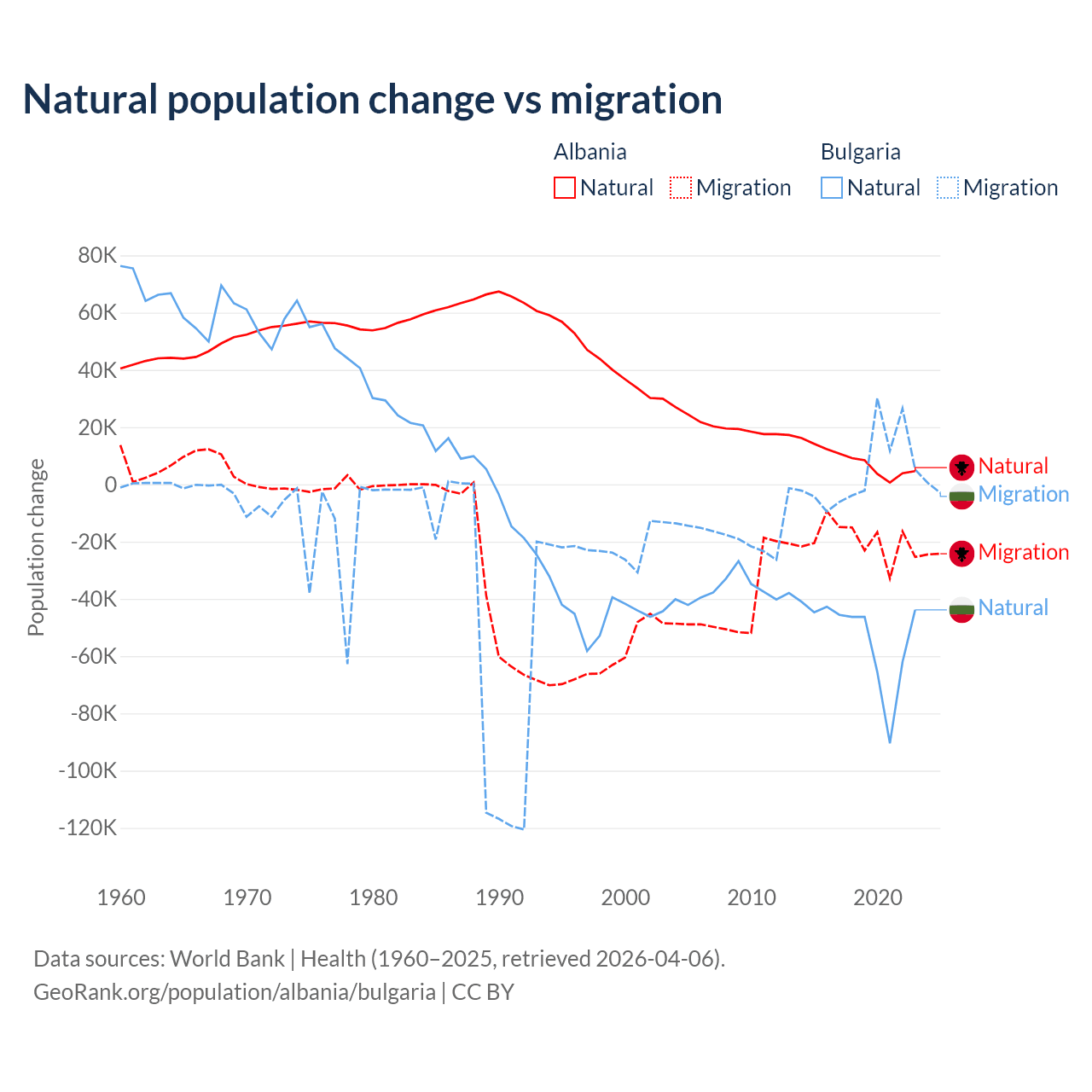 Over the last 10 years, 30% of the population change in Albania is from natural causes (a gain of 83,840 people) and 70% is from migration (a loss of 195,891 people). In Bulgaria 92.1% is from natural causes (a loss of 528,535 people) and 7.94% is from migration (a gain of 45,567 people).