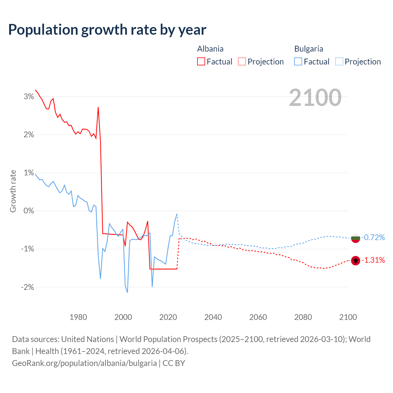 - For the last 10 years, Albania has had an average growth rate of -1.53% per year vs -0.96% in Bulgaria.