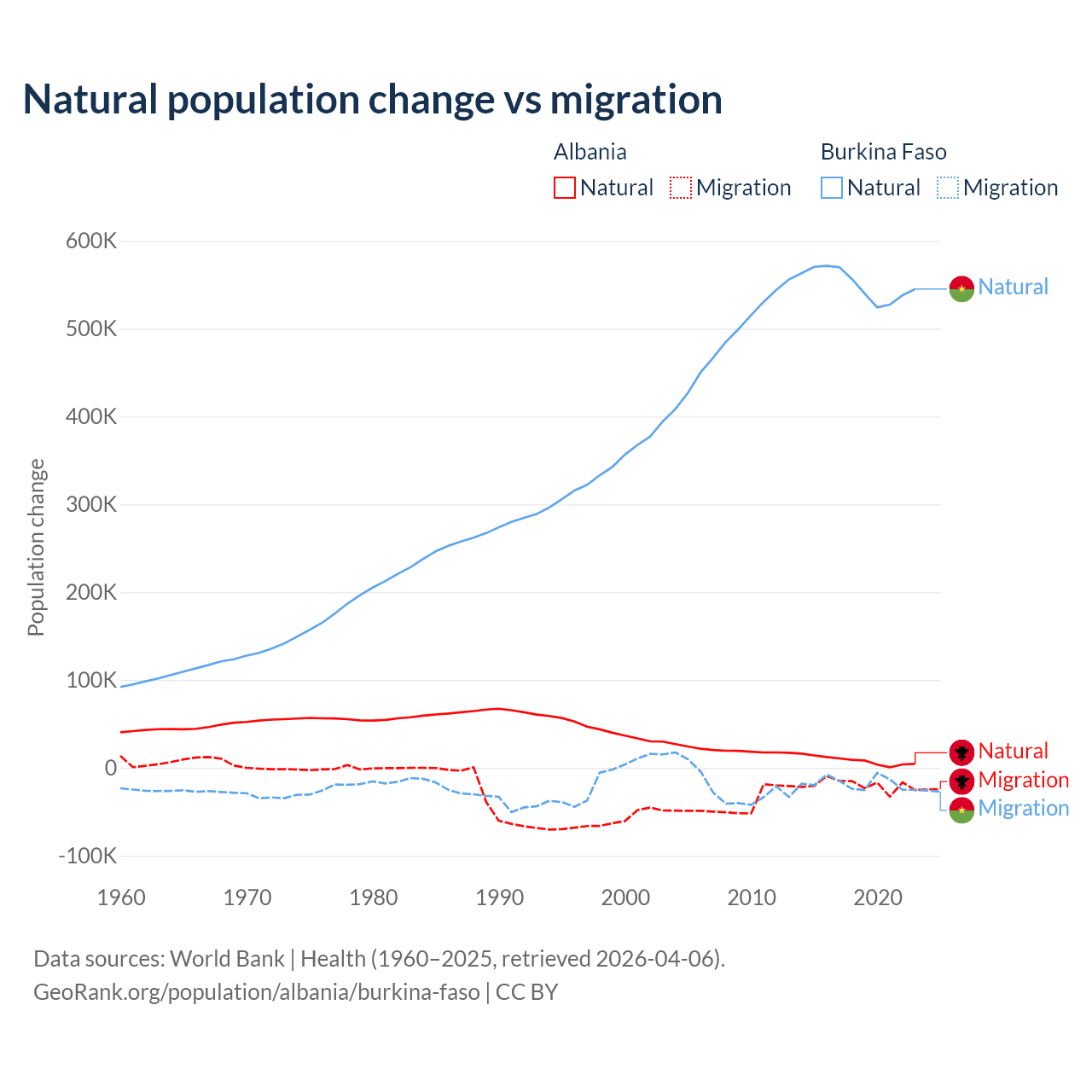 Over the last 10 years, 30% of the population change in Albania is from natural causes (a gain of 83,840 people) and 70% is from migration (a loss of 195,891 people). In Burkina Faso 96.9% is from natural causes (a gain of 5,506,960 people) and 3.13% is from migration (a loss of 177,923 people).