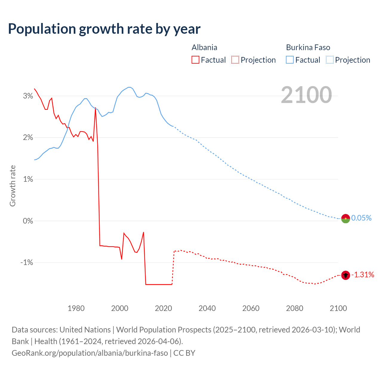 - For the last 10 years, Albania has had an average growth rate of -1.53% per year vs +2.63% in Burkina Faso.