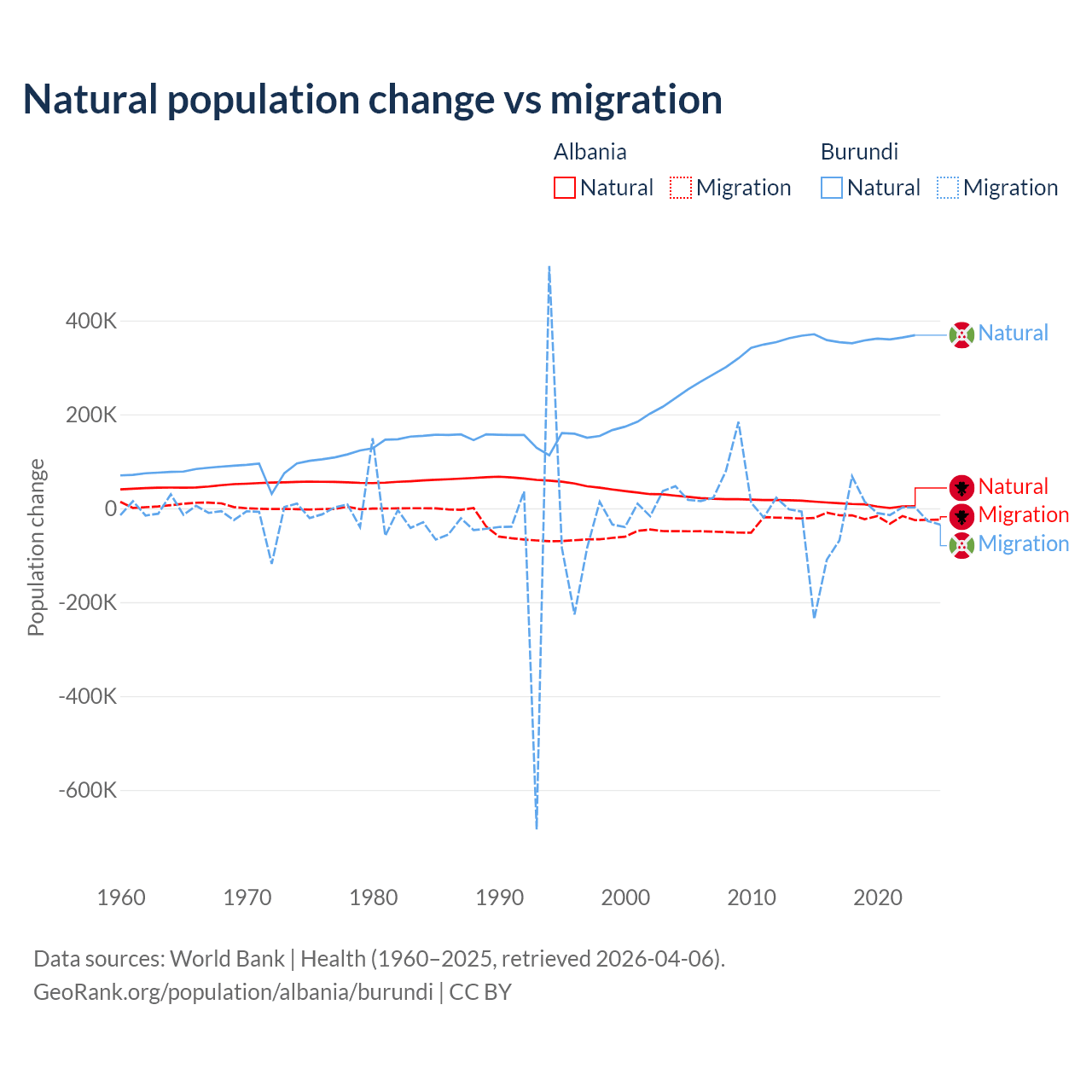 Over the last 10 years, 30% of the population change in Albania is from natural causes (a gain of 83,840 people) and 70% is from migration (a loss of 195,891 people). In Burundi 91% is from natural causes (a gain of 3,614,502 people) and 9.03% is from migration (a loss of 358,928 people).