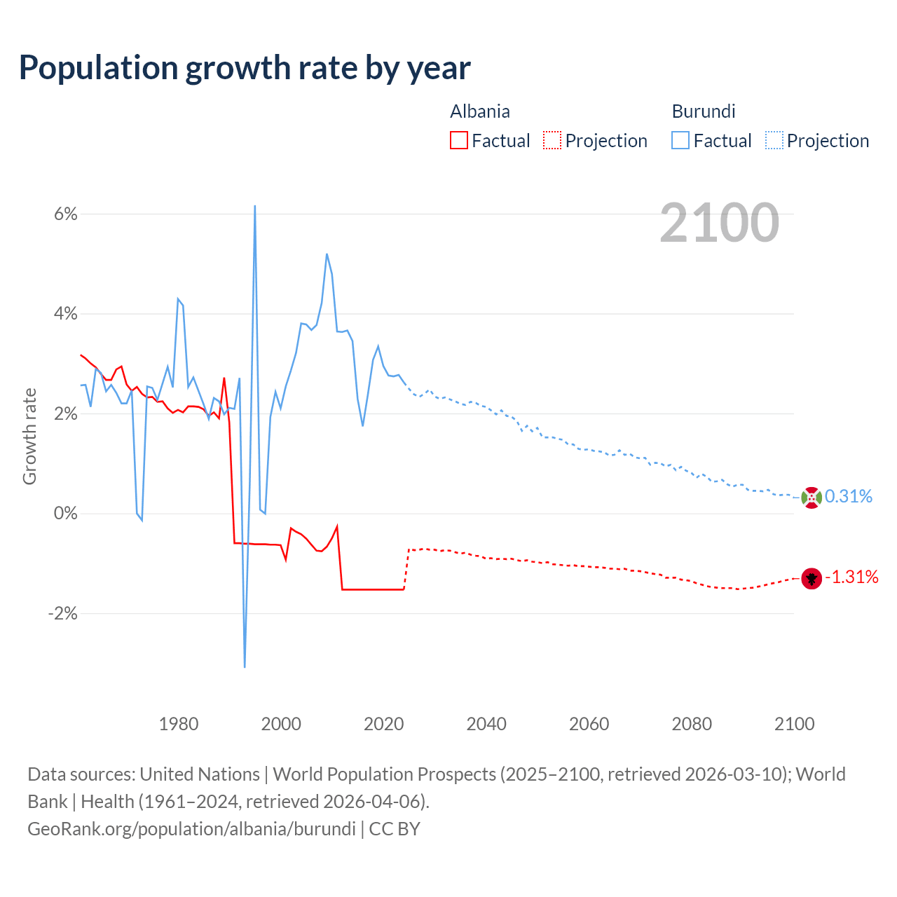 - For the last 10 years, Albania has had an average growth rate of -1.53% per year vs +2.74% in Burundi.
