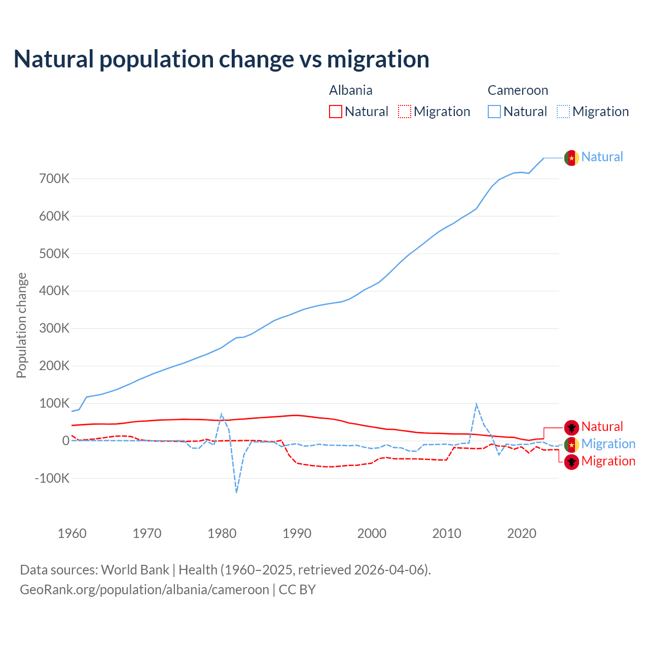 Over the last 10 years, 30% of the population change in Albania is from natural causes (a gain of 83,840 people) and 70% is from migration (a loss of 195,891 people). In Cameroon 99.1% is from natural causes (a gain of 6,982,395 people) and 0.9% is from migration (a gain of 63,139 people).