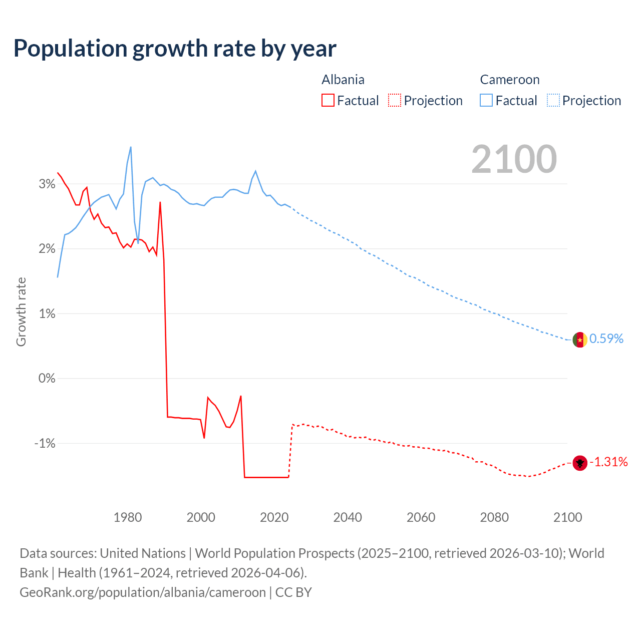 - For the last 10 years, Albania has had an average growth rate of -1.53% per year vs +2.84% in Cameroon.