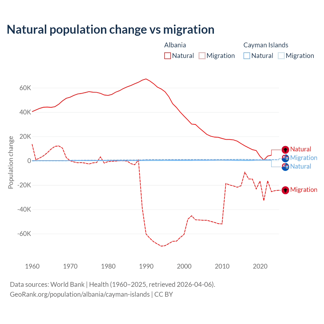 Over the last 10 years, 30% of the population change in Albania is from natural causes (a gain of 83,840 people) and 70% is from migration (a loss of 195,891 people). In the Cayman Islands 31.1% is from natural causes (a gain of 4,468 people) and 68.9% is from migration (a gain of 9,879 people).