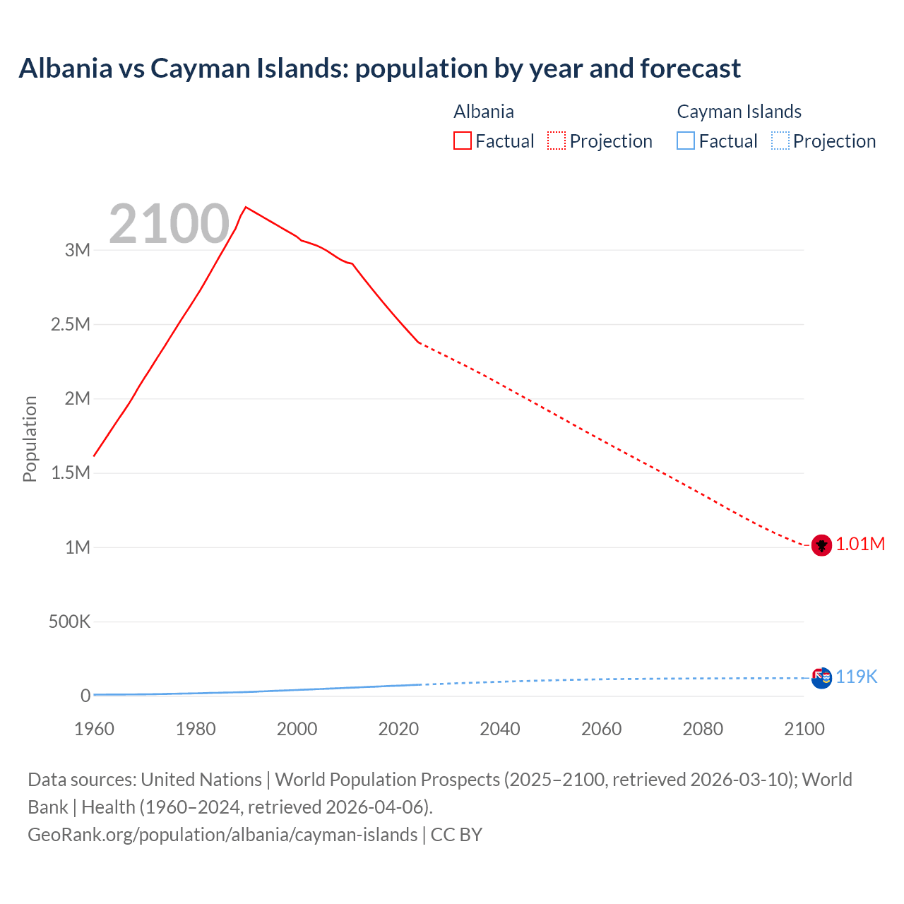 Albania vs Cayman Islands: population by year and forecast