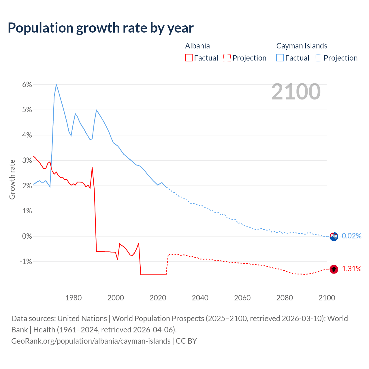 - For the last 10 years, Albania has had an average growth rate of -1.53% per year vs +2.19% in the Cayman Islands.