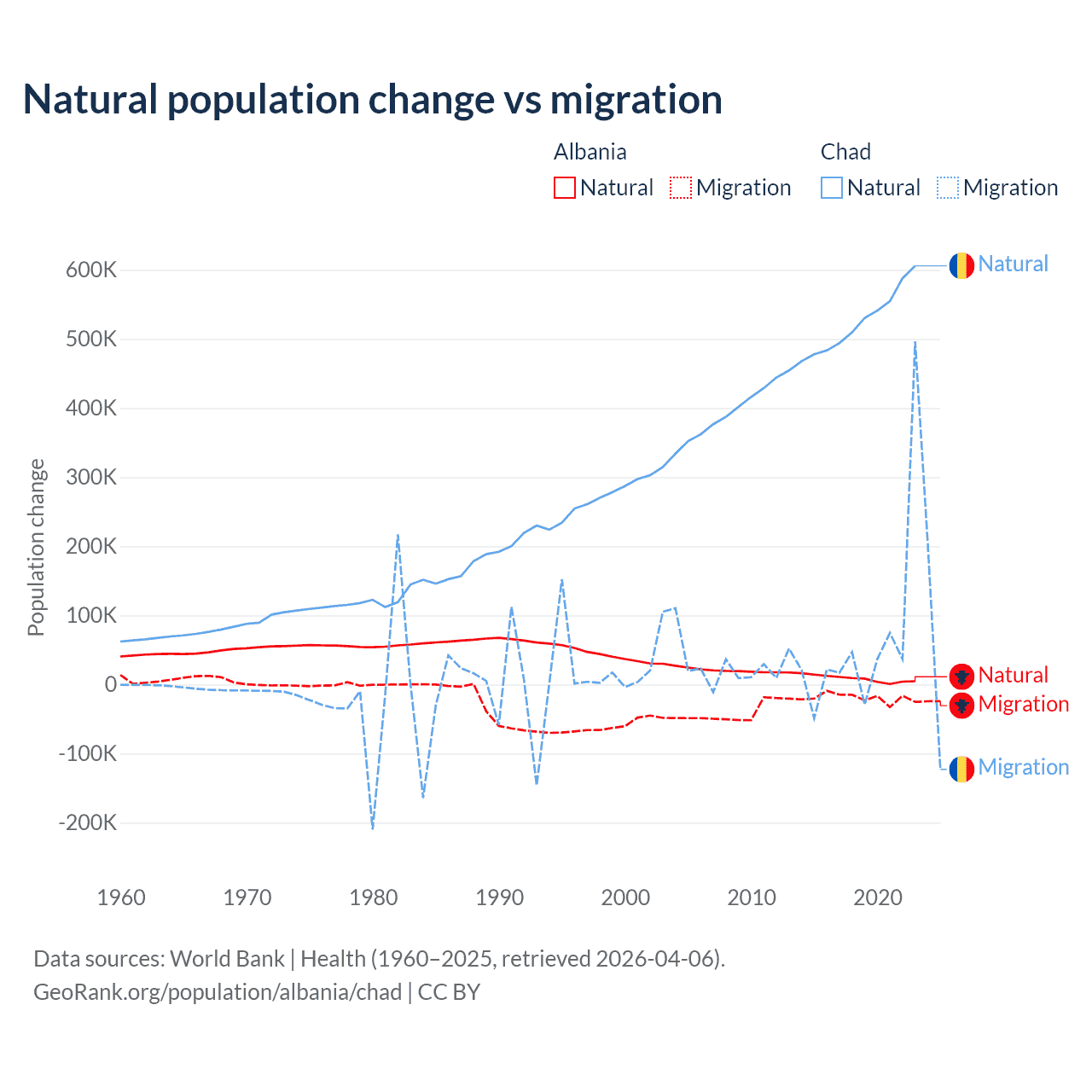 Over the last 10 years, 30% of the population change in Albania is from natural causes (a gain of 83,840 people) and 70% is from migration (a loss of 195,891 people). In Chad 88.7% is from natural causes (a gain of 5,253,964 people) and 11.3% is from migration (a gain of 672,204 people).