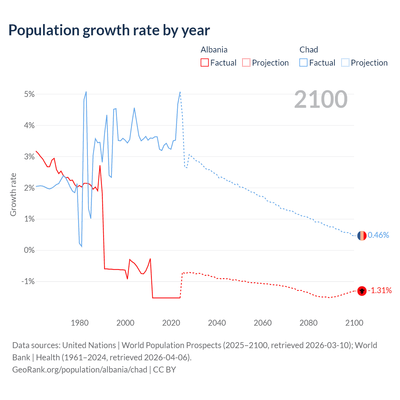 - For the last 10 years, Albania has had an average growth rate of -1.53% per year vs +3.65% in Chad.