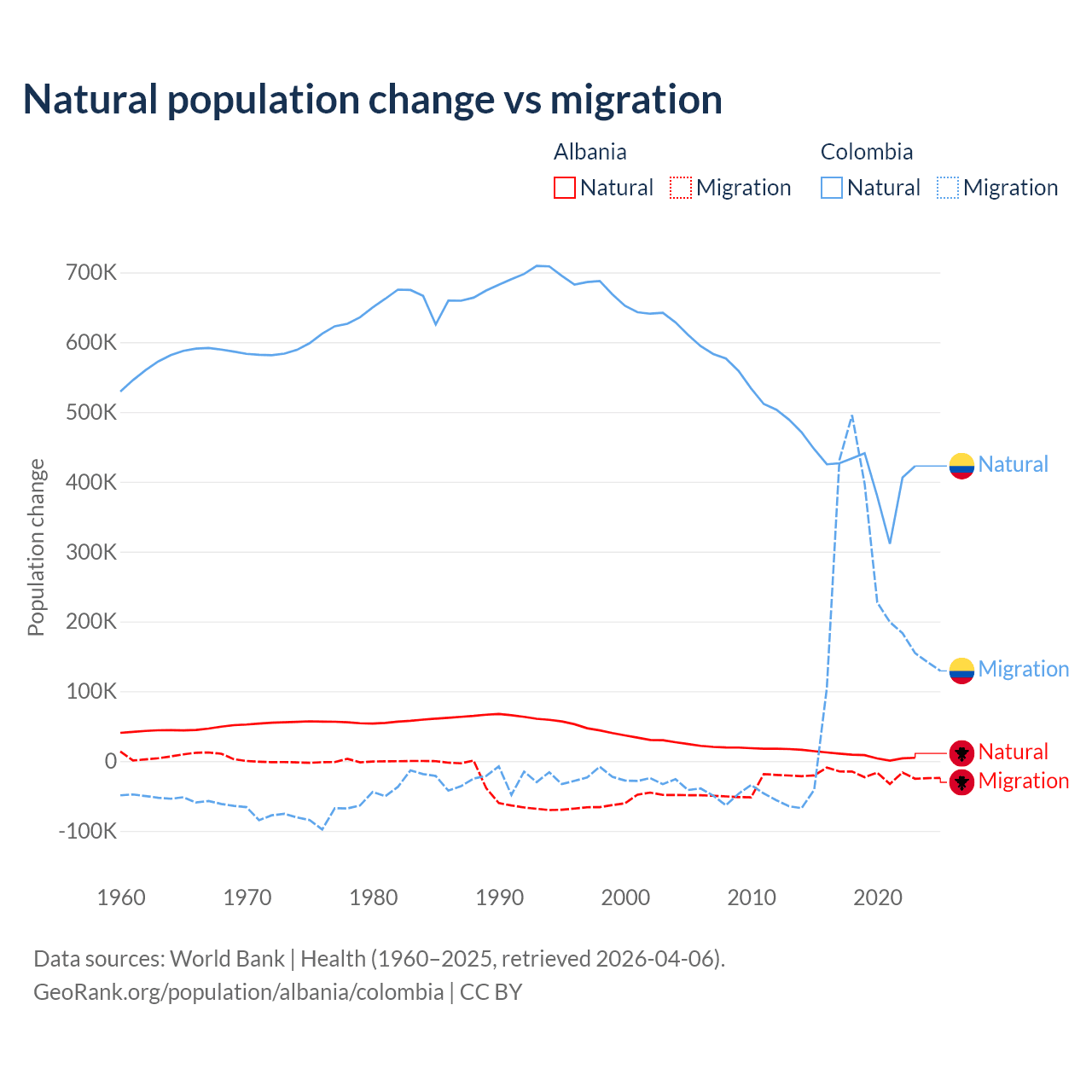 Over the last 10 years, 30% of the population change in Albania is from natural causes (a gain of 83,840 people) and 70% is from migration (a loss of 195,891 people). In Colombia 66.6% is from natural causes (a gain of 4,162,856 people) and 33.4% is from migration (a gain of 2,083,051 people).