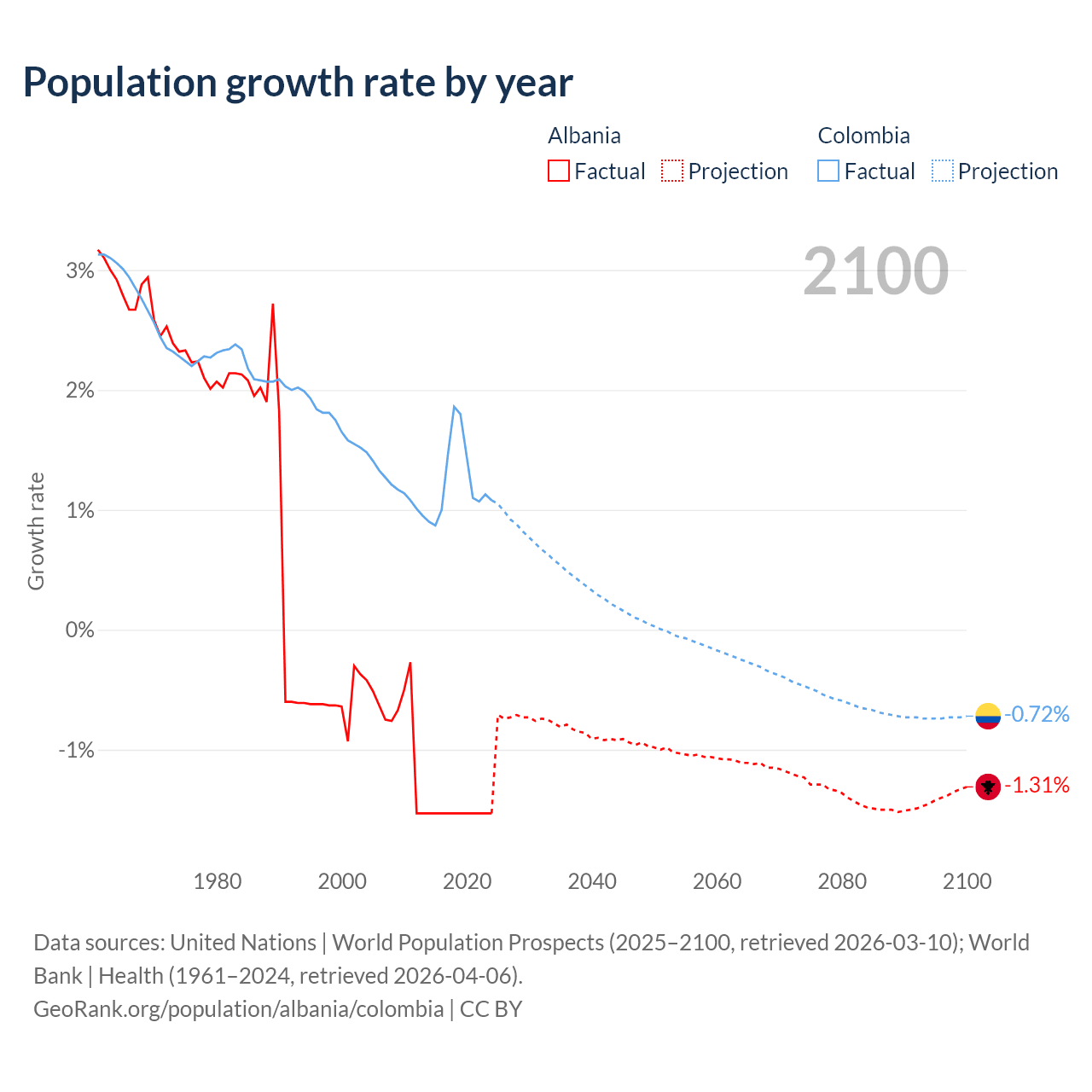 - For the last 10 years, Albania has had an average growth rate of -1.53% per year vs +1.25% in Colombia.
