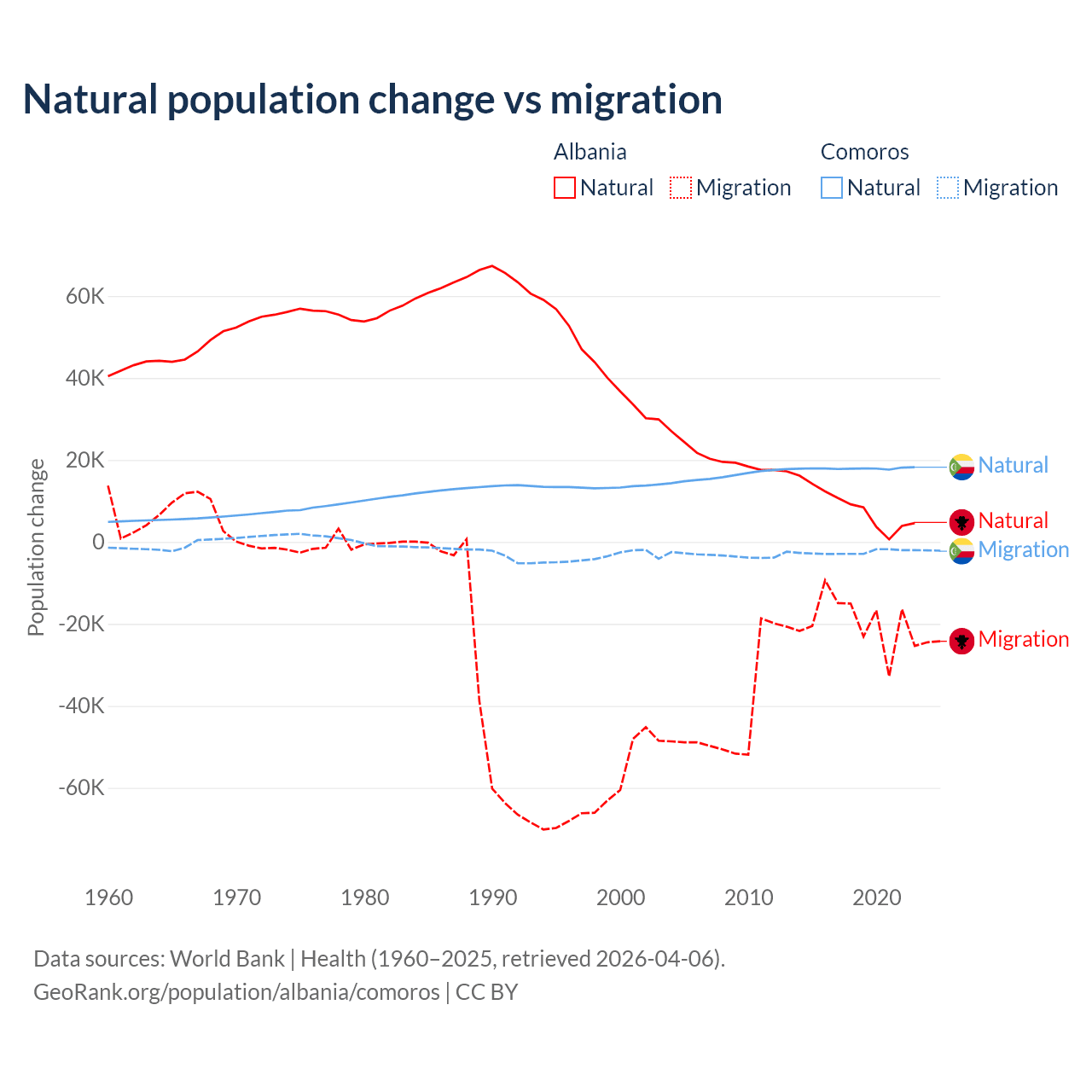 Over the last 10 years, 30% of the population change in Albania is from natural causes (a gain of 83,840 people) and 70% is from migration (a loss of 195,891 people). In Comoros 87.9% is from natural causes (a gain of 179,319 people) and 12.1% is from migration (a loss of 24,709 people).
