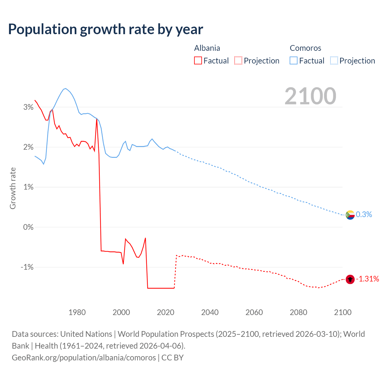 - For the last 10 years, Albania has had an average growth rate of -1.53% per year vs +2.01% in Comoros.