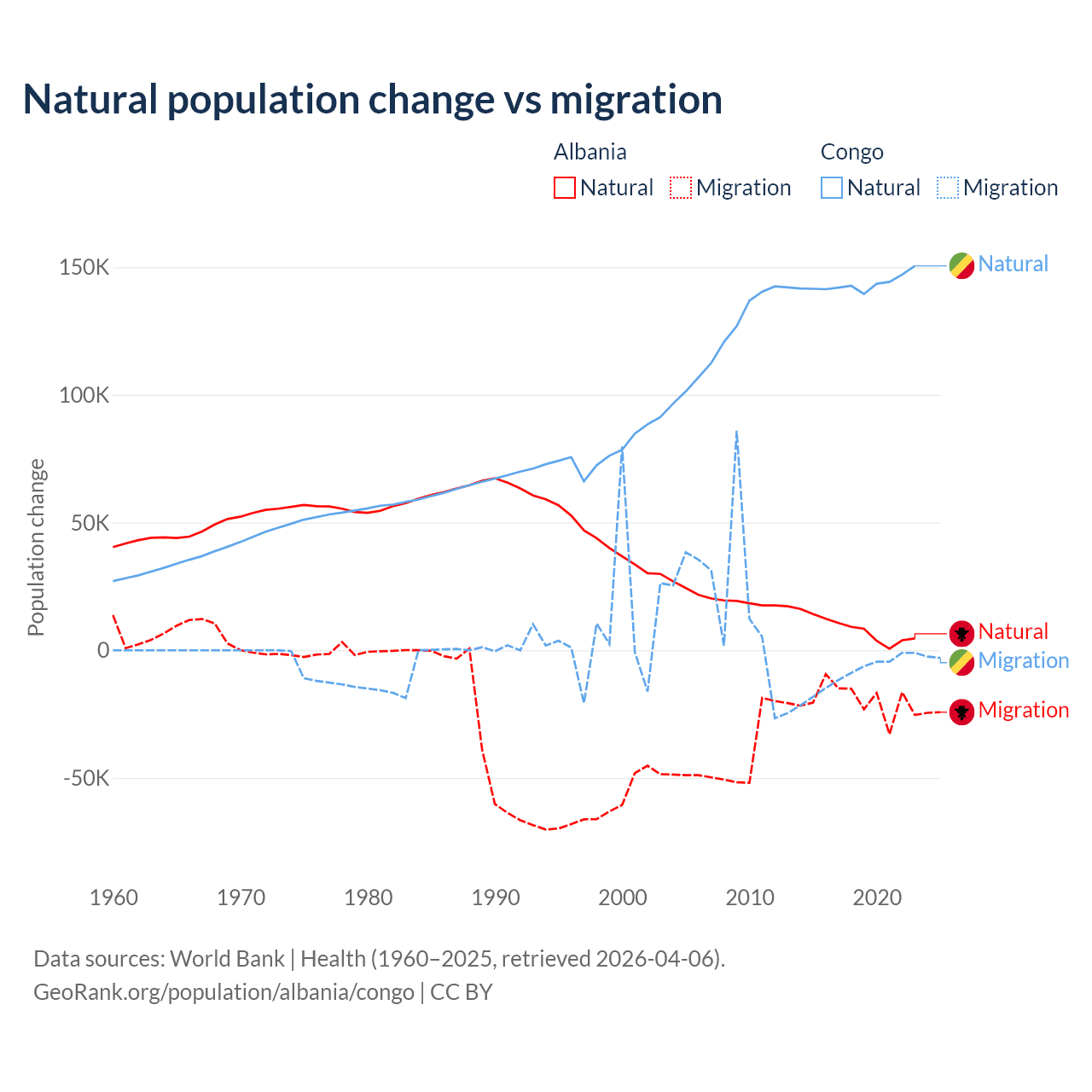 Over the last 10 years, 30% of the population change in Albania is from natural causes (a gain of 83,840 people) and 70% is from migration (a loss of 195,891 people). In the Congo 94% is from natural causes (a gain of 1,434,056 people) and 6.04% is from migration (a loss of 92,251 people).