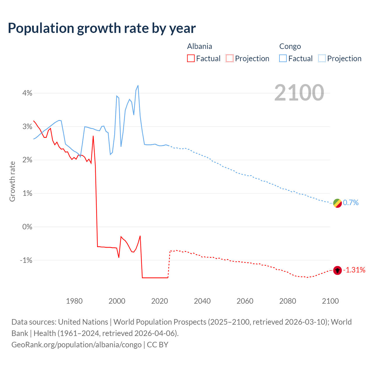 - For the last 10 years, Albania has had an average growth rate of -1.53% per year vs +2.44% in the Congo.