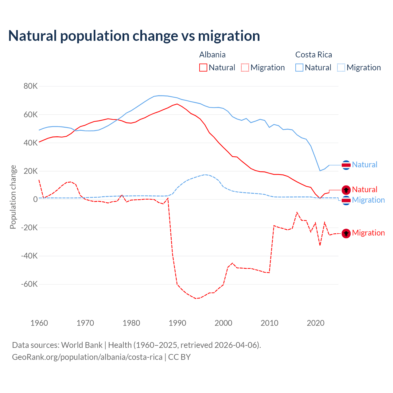 Over the last 10 years, 30% of the population change in Albania is from natural causes (a gain of 83,840 people) and 70% is from migration (a loss of 195,891 people). In Costa Rica 96.3% is from natural causes (a gain of 362,624 people) and 3.69% is from migration (a gain of 13,900 people).