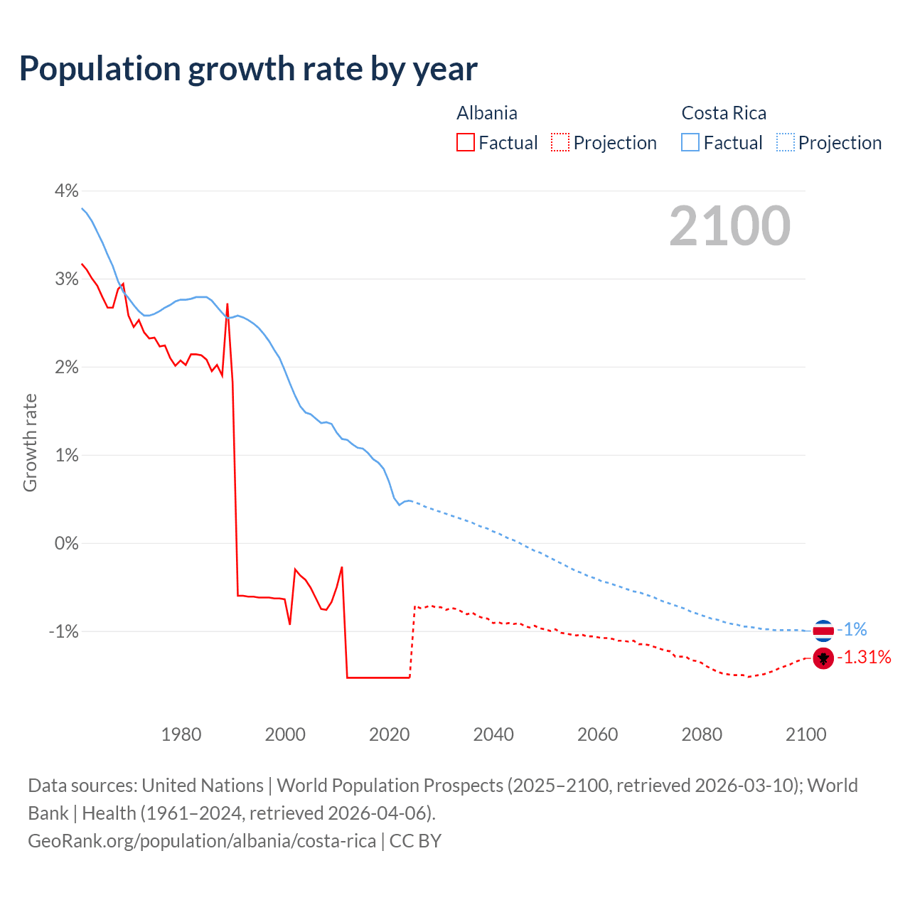- For the last 10 years, Albania has had an average growth rate of -1.53% per year vs +0.77% in Costa Rica.