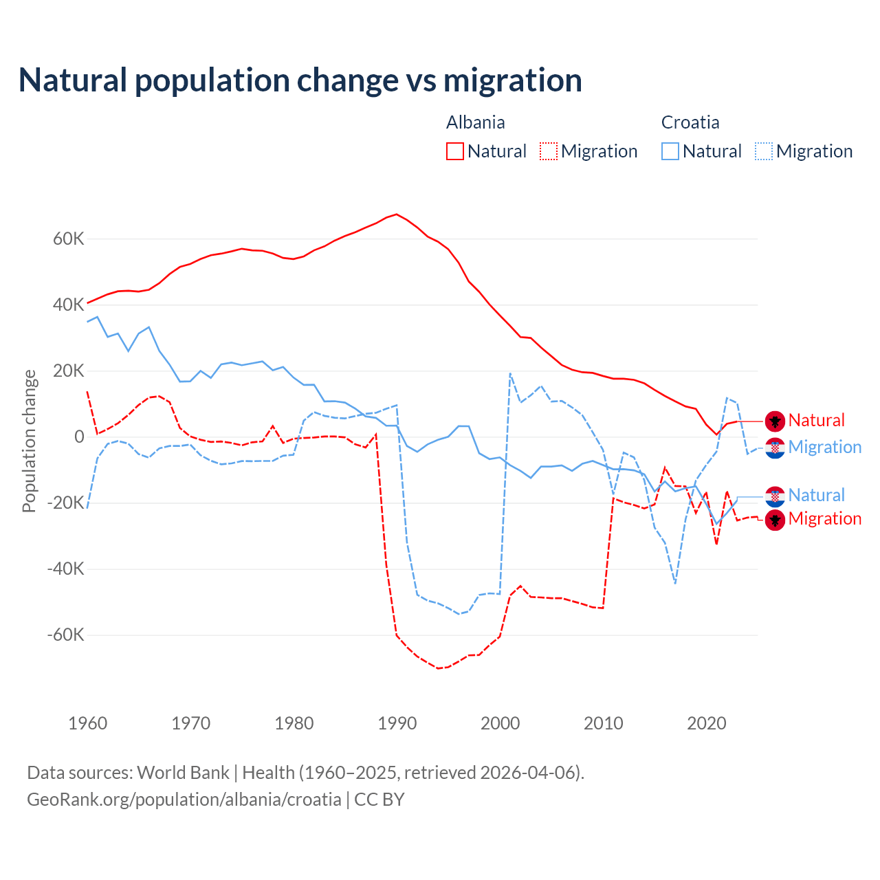 Over the last 10 years, 30% of the population change in Albania is from natural causes (a gain of 83,840 people) and 70% is from migration (a loss of 195,891 people). In Croatia 54.8% is from natural causes (a loss of 177,803 people) and 45.2% is from migration (a loss of 146,770 people).