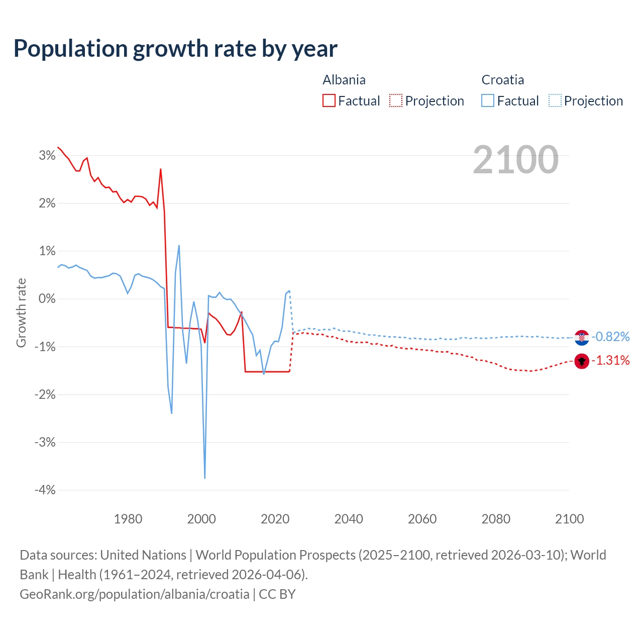 - For the last 10 years, Albania has had an average growth rate of -1.53% per year vs -0.82% in Croatia.