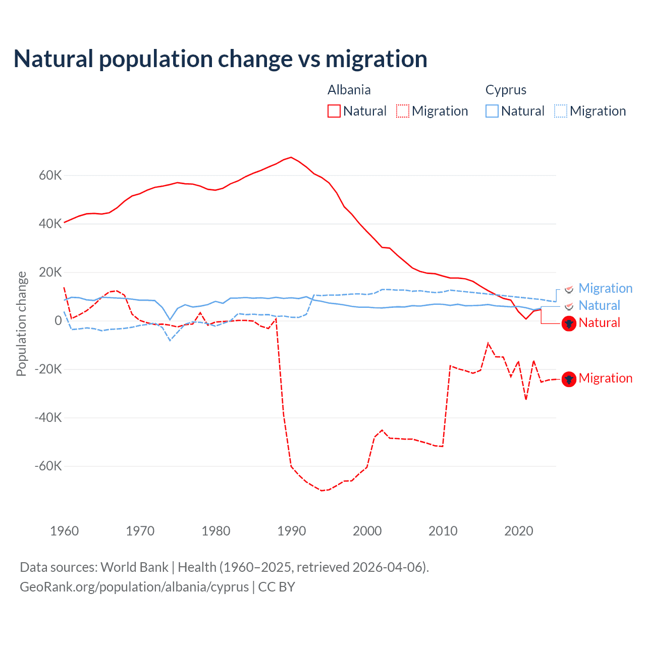 Over the last 10 years, 30% of the population change in Albania is from natural causes (a gain of 83,840 people) and 70% is from migration (a loss of 195,891 people). In Cyprus 36.2% is from natural causes (a gain of 57,464 people) and 63.8% is from migration (a gain of 101,458 people).