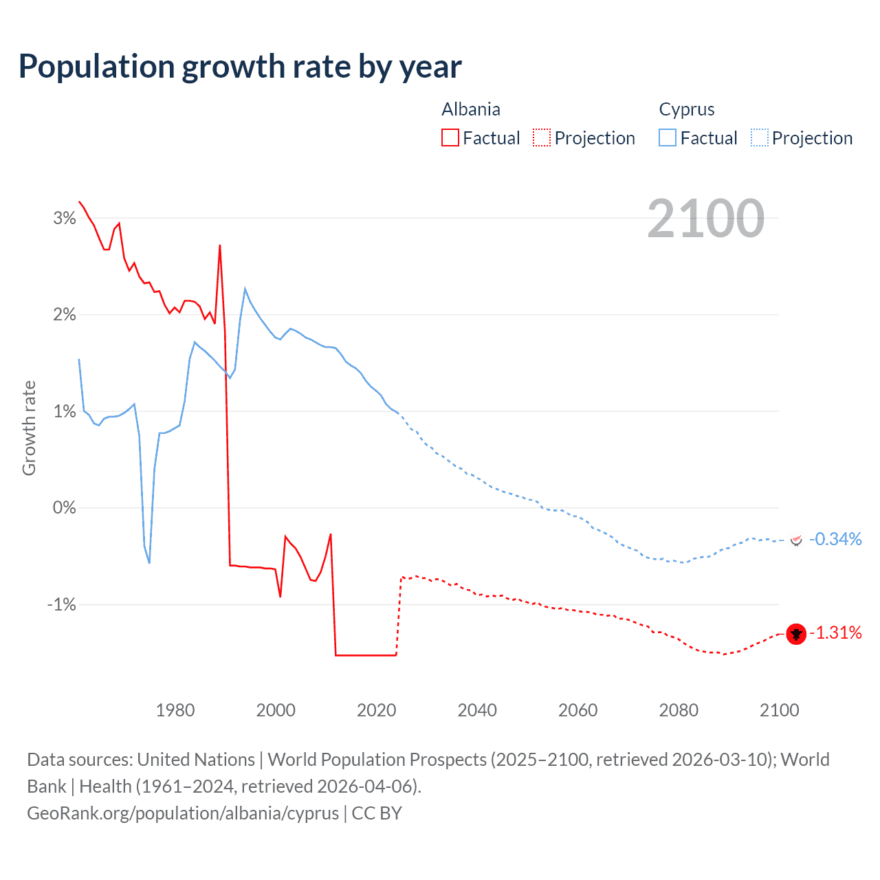 - For the last 10 years, Albania has had an average growth rate of -1.53% per year vs +1.26% in Cyprus.